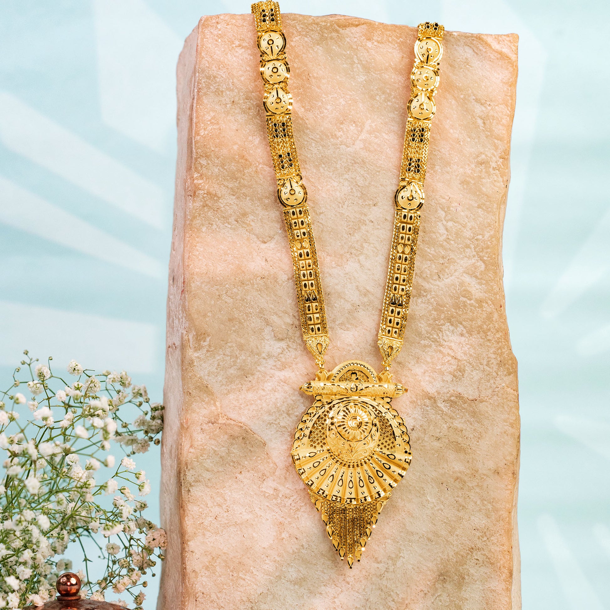 Introducing our Celestial Knot mangalsutra with a golden sunburst, crafted in filigree lace. From its intricate heart, tiny golden tears of light cascade. This 24k gold SmartGold is a radiant symbol of timeless beauty and tradition.