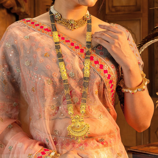 The love that speaks volumes with our Imperial Aura mangalsutra. This sequinned mangalsutra is beautifully crafted with 24k gold, symbolising the fine artistry of love and tradition. Designed for the modern woman, this mangalsutra seamlessly pairs with both ethnic attire and everyday wear, making it a timeless piece that radiates grace and sophistication.