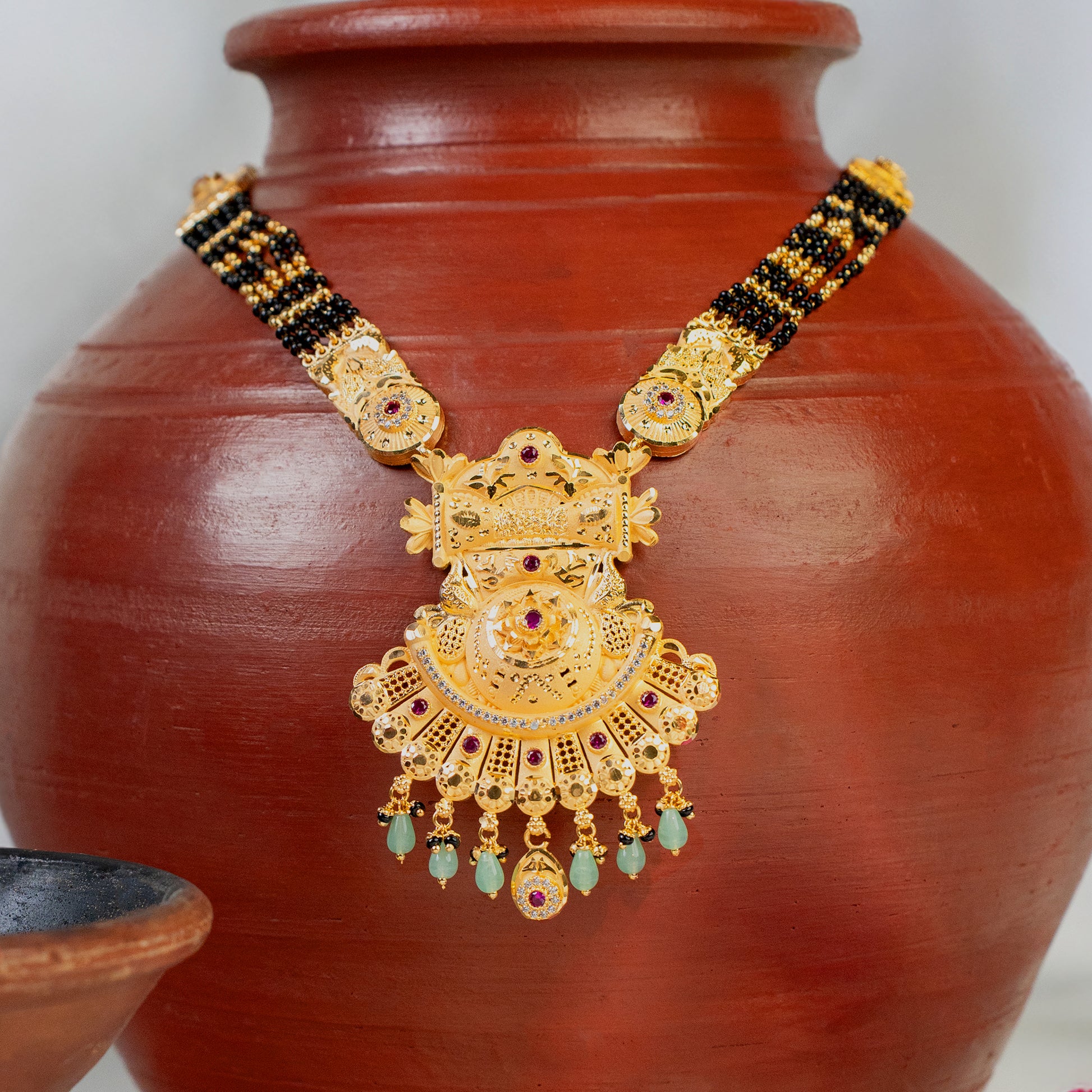Celebrate your marital bond with Ritvaa’s Regal Bloom. A gold-inlaid 24k mangalsutra, with intricate round-disc detailing. An epitome of traditional elegance and modern simplicity brought together in the form of a mangalsutra.