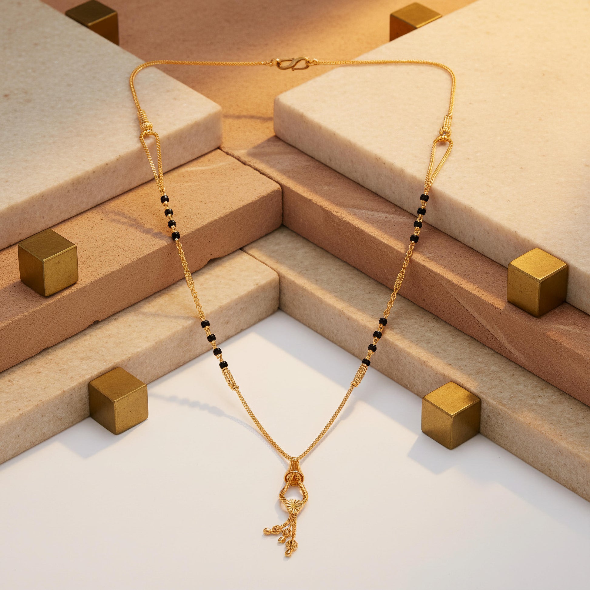 Suspended from a cord of dark beads and golden accents, this 24k SmartGold Forgotten Era mangalsutra features an antiqued, twisted metal loop that evokes the charm of a forgotten era. Finished with delicate golden charms that sway softly below, the piece blends rustic artistry with timeless elegance an heirloom whispering stories of ancient grace.