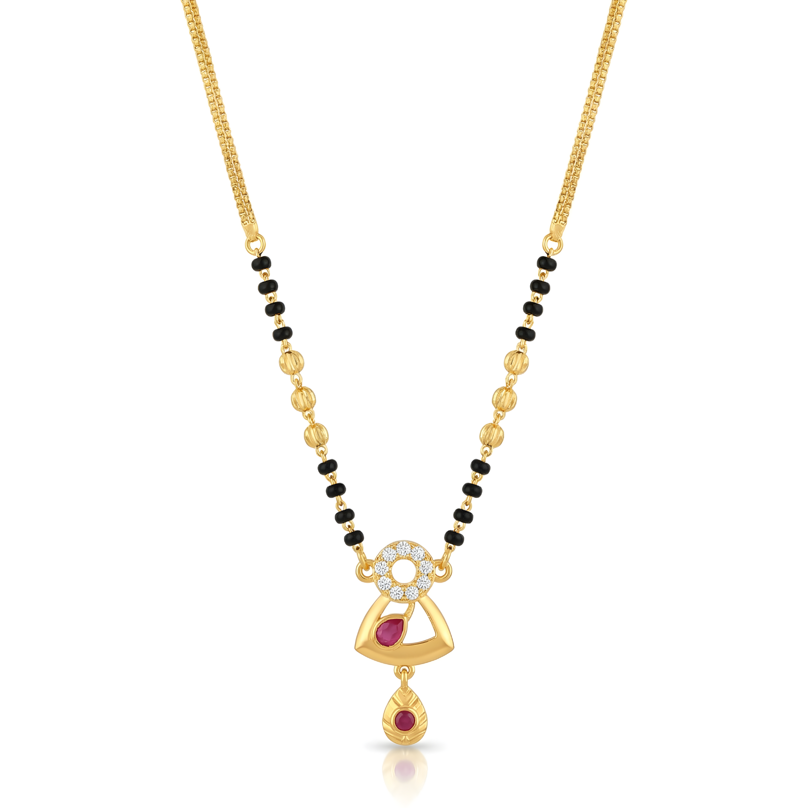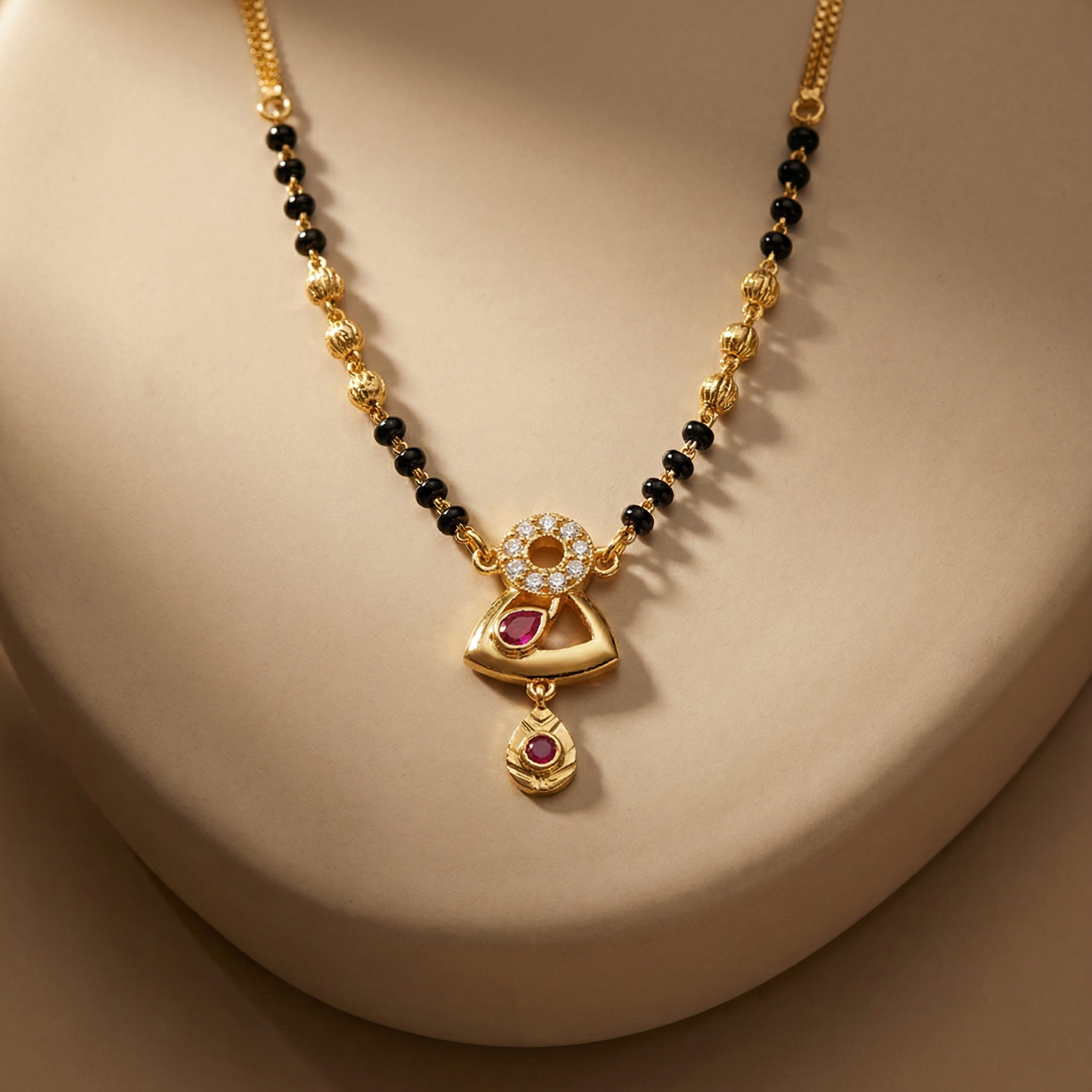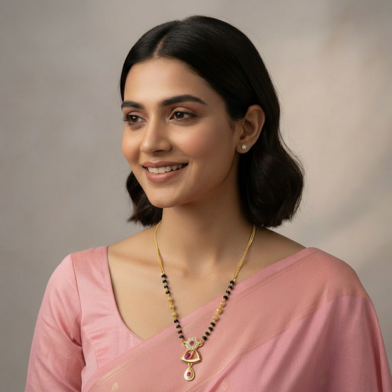 An elegant gold chain paired with slender strands of black beads, drawing the eye to a softly carved pendant with intricate details and a ruby-colored highlight at its center. Concluding with a gentle drop that swings with her pulse, the piece appears collected and intimate. Subtle yet significant, this mangalsutra is designed to be worn daily – as a statement of presence, not proclamation.