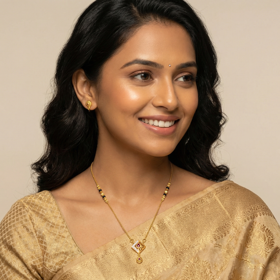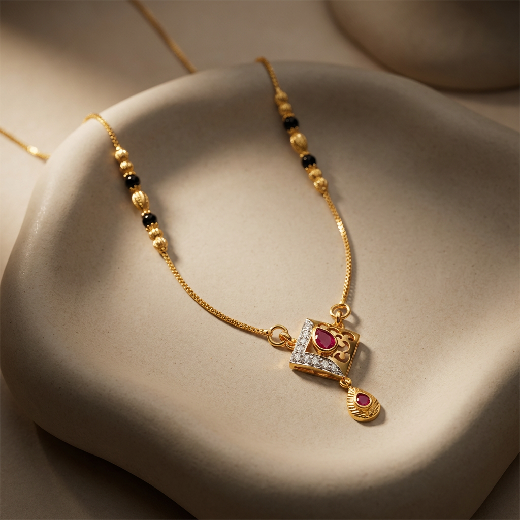 A Slender gold chain and carefully crafted black beads progress to a chiseled pendant, topped with delicate ornamentation and featuring a rich, ruby-colored gemstone at its center. A single drop below adds a sense of movement, as if the beat of the heart itself is being softly echoed. This mangalsutra is thoughtful and collected, imbuing warmth not as decoration, but as presence to be felt up close and every day.