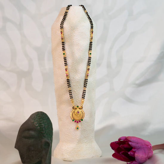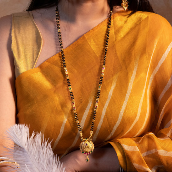 A gold-inlaid Morning Dew mangal sutra is a symbol of eternal love and modern elegance. Crafted with luxurious 24k gold, this pan-shaped mangal sutra adds timeless sparkle. Lightweight yet durable, it beautifully blends tradition with modern routine. A mangal sutra for women who carry grace with style.