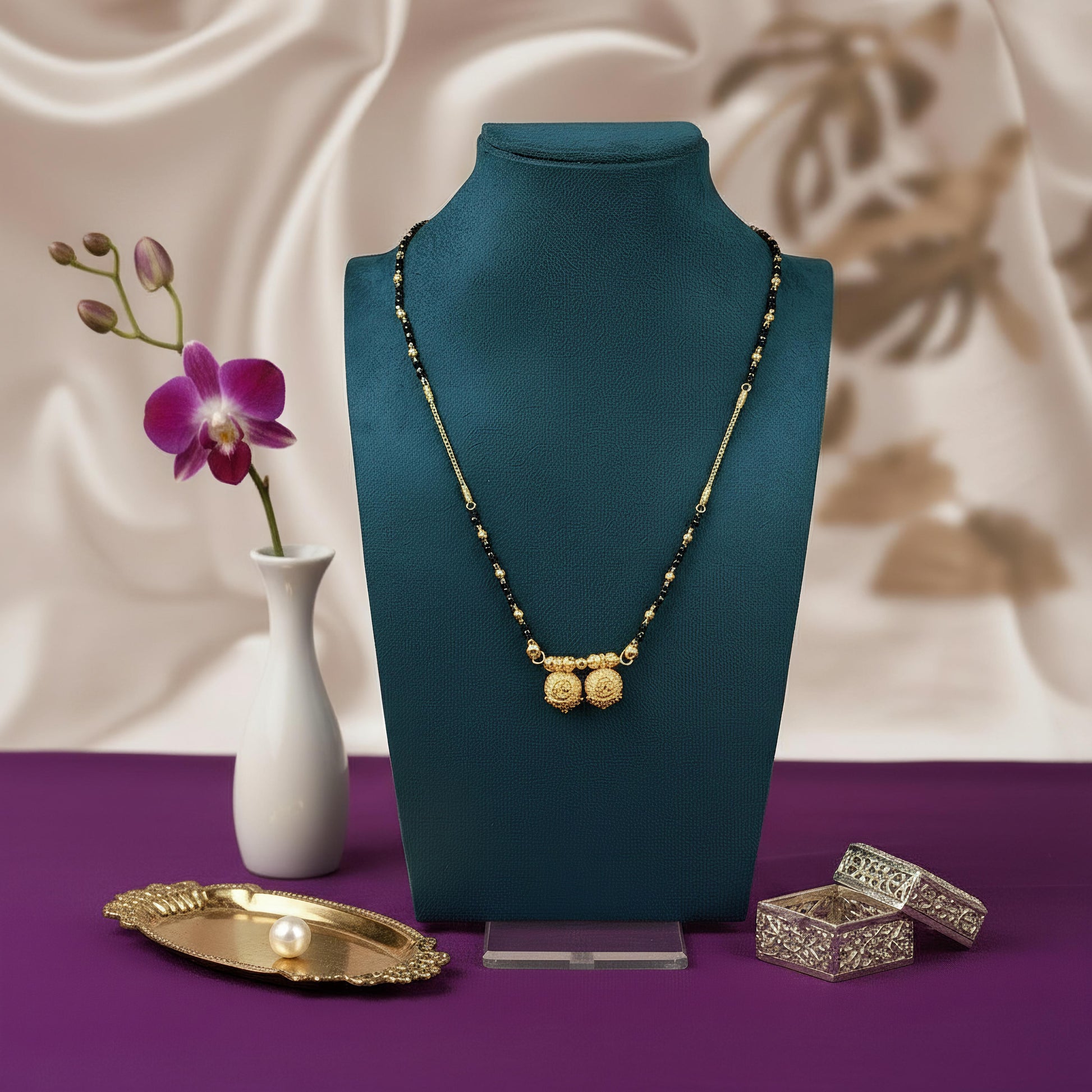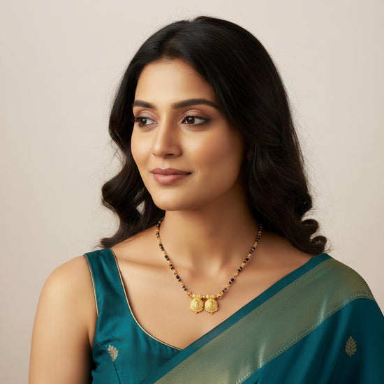 A radiant blend of tradition and protection, this 24k SmartGold Prosperity Thread mangalsutra features gleaming gold pendants suspended from a sacred thread of lustrous black beads. The timeless contrast symbolizes prosperity, divine protection, and the eternal bond shared between two souls, an emblem of love woven with blessings.