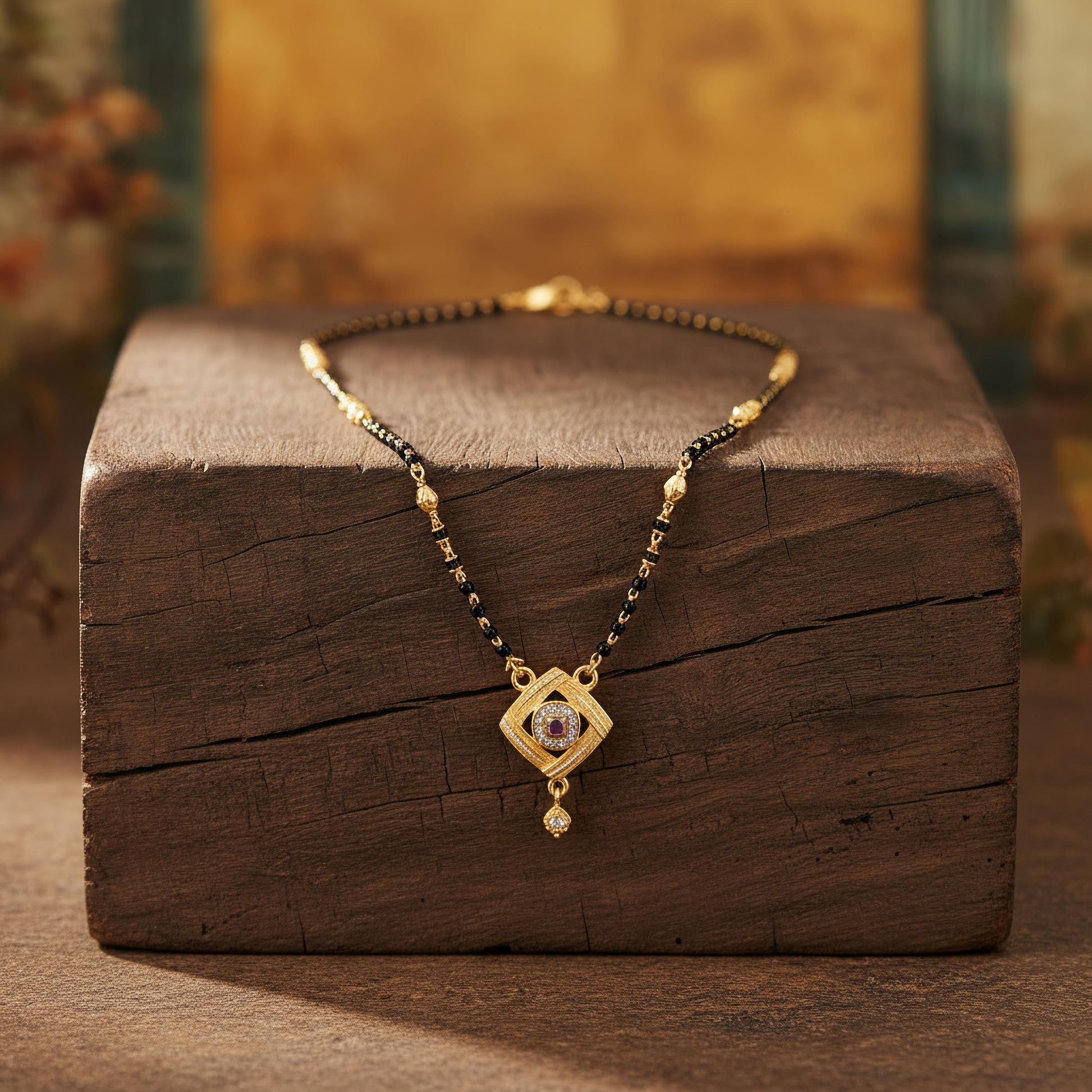 Introducing the gold inlaid Scarlet Radiance mangalsutra, a radiant square pendant steals the spotlight; its deep red gemstone glowing at the center, framed by a halo of shimmering white stones. Textured layers of gold create a regal silhouette, finished with a graceful teardrop dangle that sways with subtle brilliance. Paired with dual strands of polished black beads and golden links, this mangalsutra embodies timeless elegance and cherished tradition.