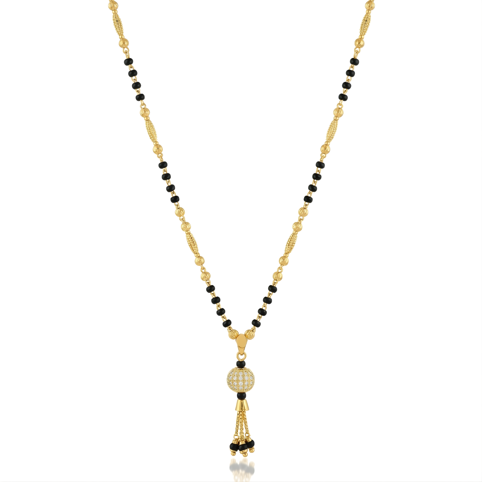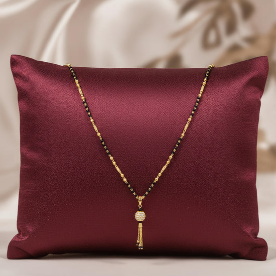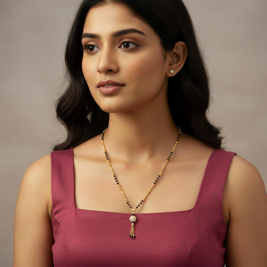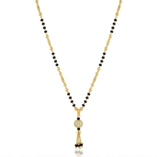 At the heart of this gold inlaid Starlit Sphere mangalsutra rests an ornate, gold-plated orb, an intricate cage of dark metalwork that glimmers like a constellation. From its base, fine golden tassels fall gracefully, tipped with dark beads that sway with every movement. Suspended from a harmonious black-and-gold chain, this pendant captures a universe of artistry in a single, captivating piece.