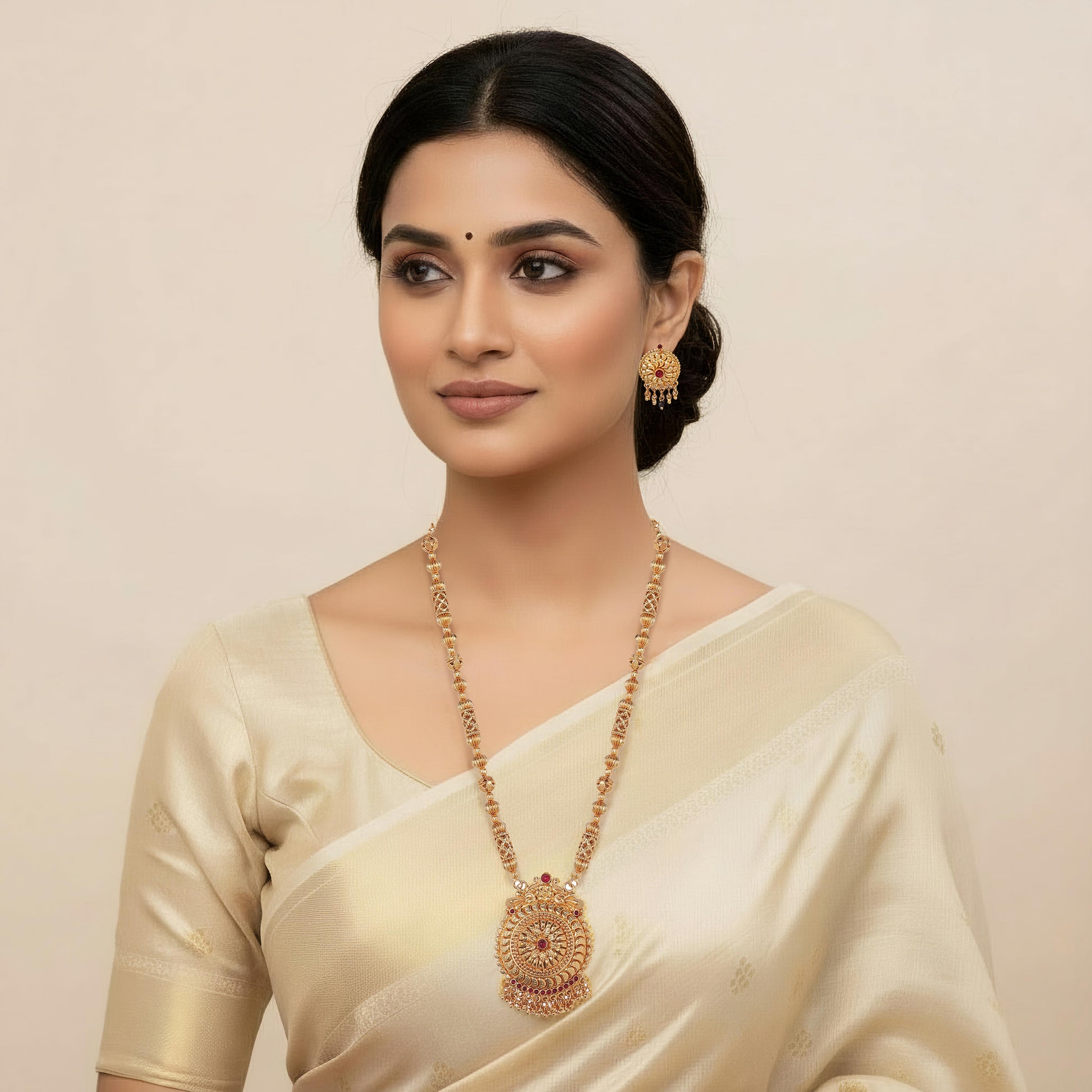 A luminous Heritage Suncrest long mala set is a 24k SmartGold. This pendant blossoms with intricate filigree radiating from a textured core, creating a captivating mandala of light. Tiny golden droplets grace its edge, adding movement and quiet grandeur. Paired with an ornate har-style chain, this long necklace embodies timeless beauty and heritage craftsmanship.