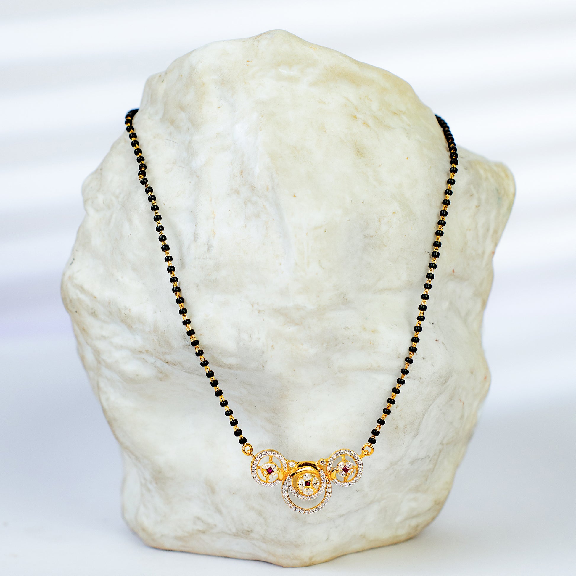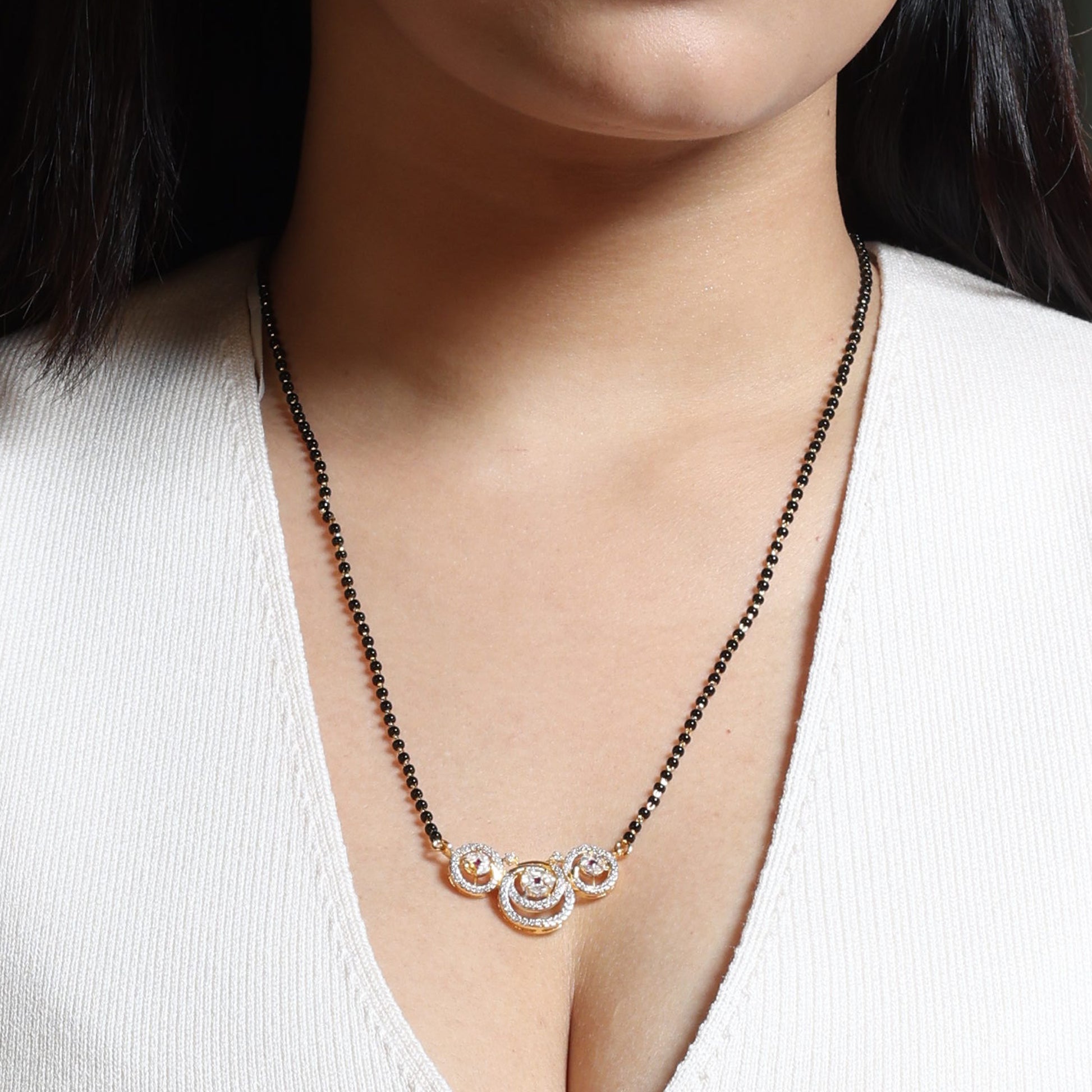 This 24k gold-inlaid Mystic mangalsutra is a symbol of grace and devotion, designed for the modern woman who values tradition with style. The pendant features a central heart-shaped design with two matching circular motifs on each side. It captures light beautifully and adds a touch of elegance to any look.