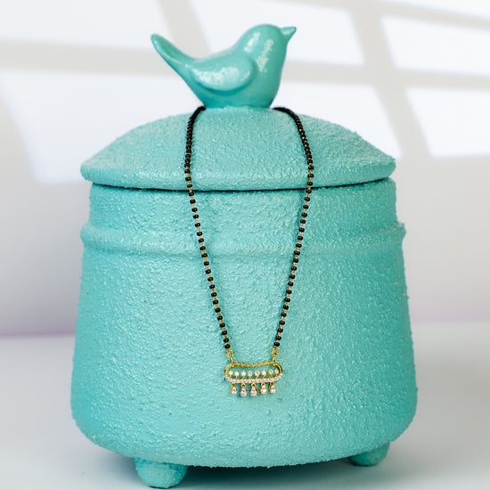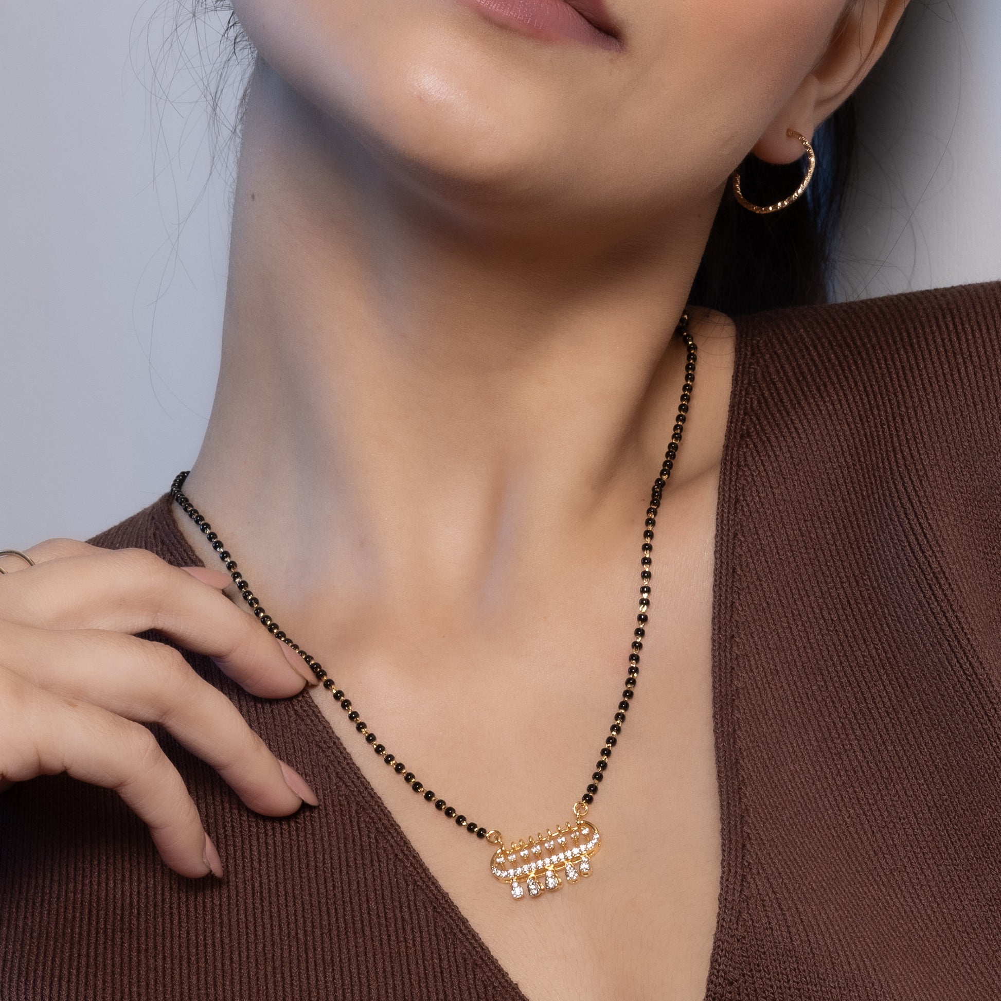 The gold-laid Radiant Drop mangalsutra is a graceful ode to eternal love and strength. Adorned with a lock-and-key feature, it reflects purity and devotion while blending seamlessly with modern elegance. Crafted in 24k gold, it is a perfect piece for everyday wear or special occasions.