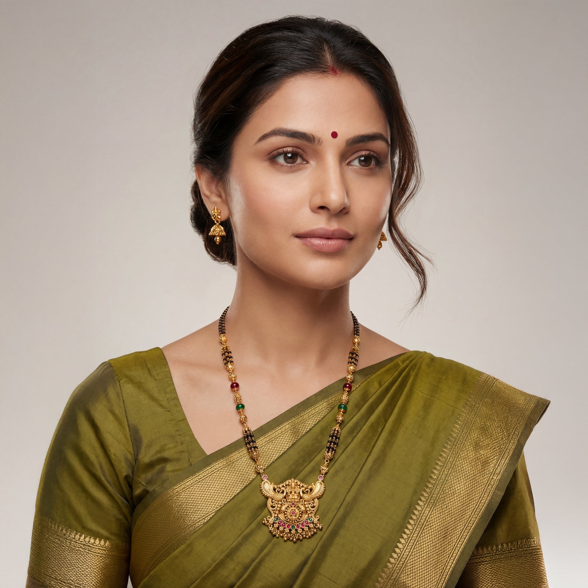 Introducing the gold sequinned Sacred Peaflight mangalsutra. A timeless ode to devotion, this 24k SmartGold pendant showcases Goddess Lakshmi seated in serene radiance, flanked by intricately carved peacocks that lend a regal flourish. Ruby and emerald accents illuminate the design, while delicate gold beads add a gentle rhythm to its divine silhouette. Rooted in tradition and crafted with exquisite detail, this piece is a symbol of grace, purity, and heritage.