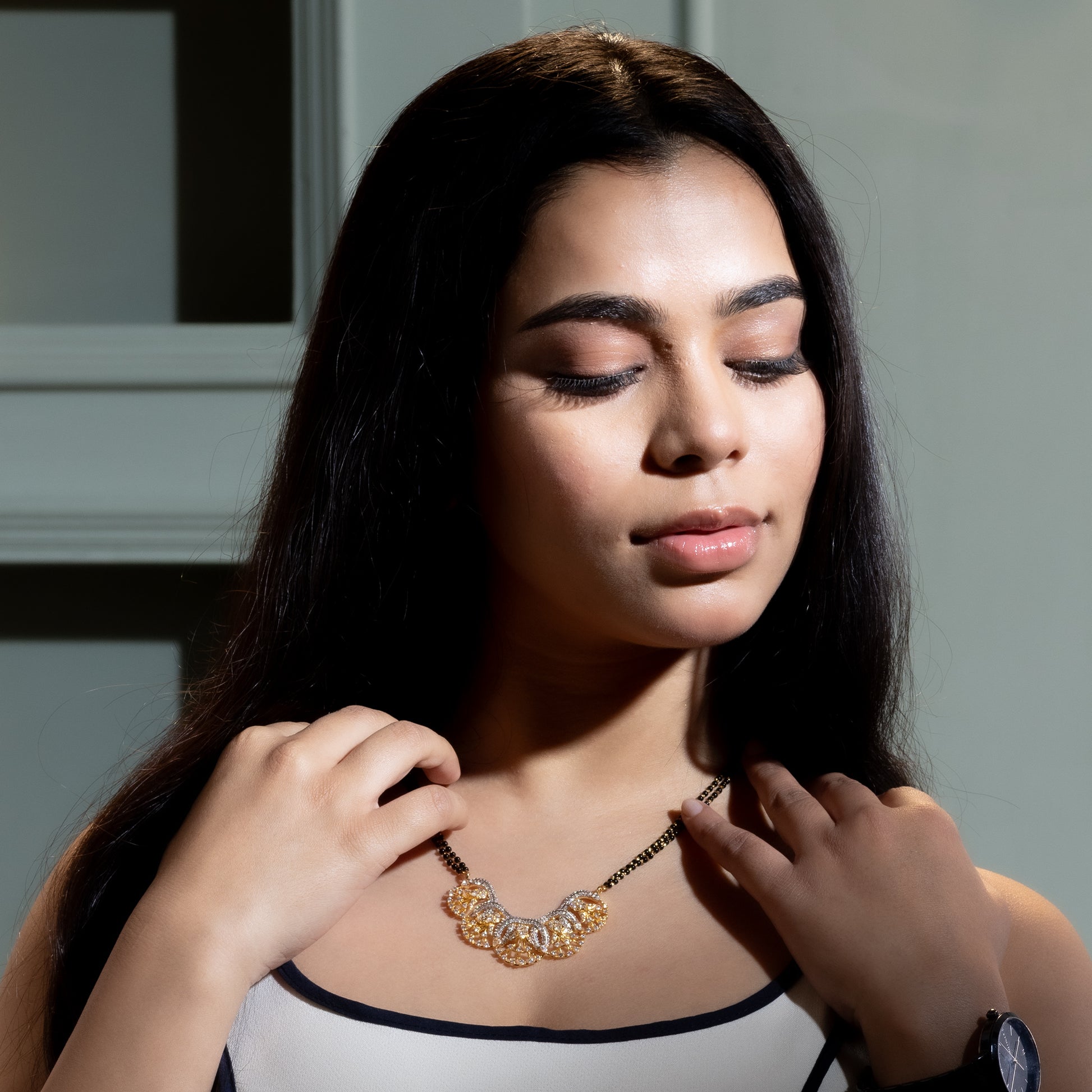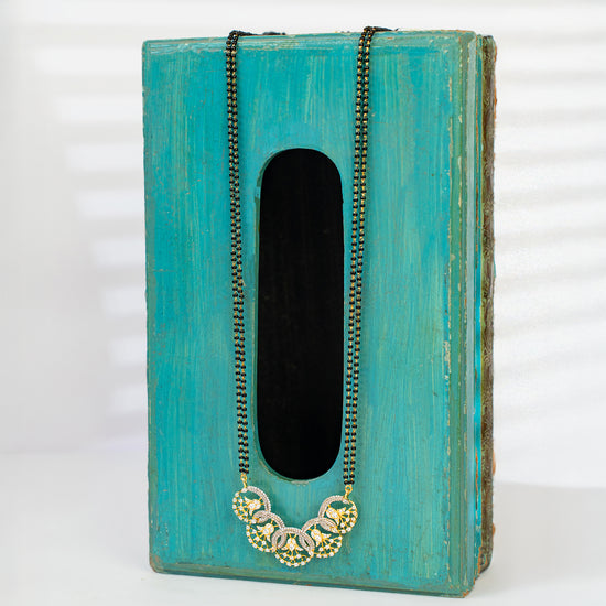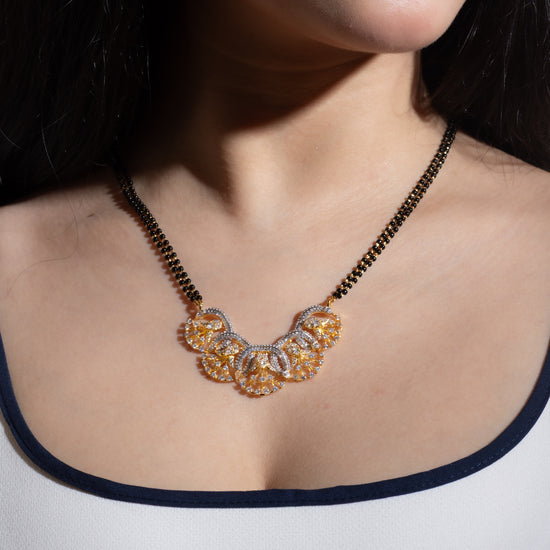 Embrace everlasting love with the Shimmer Halo mangal sutra. The pendant features circles entangled in loops. This 24k gold symbolises the Pavitra pheras of a marriage. This smart gold is perfect for everyday wear as well as ethnic wear.