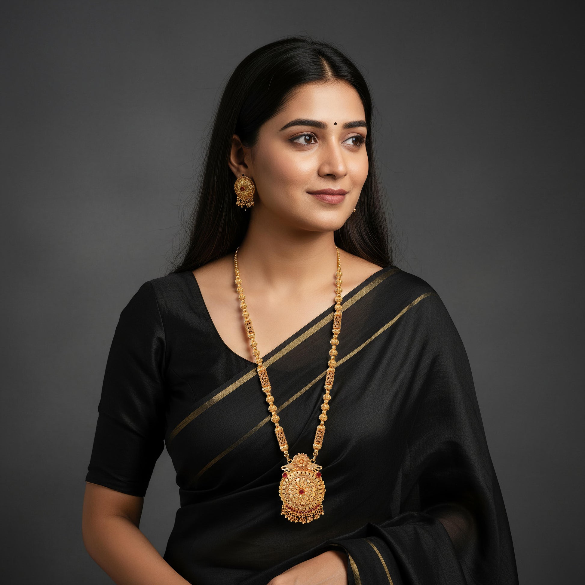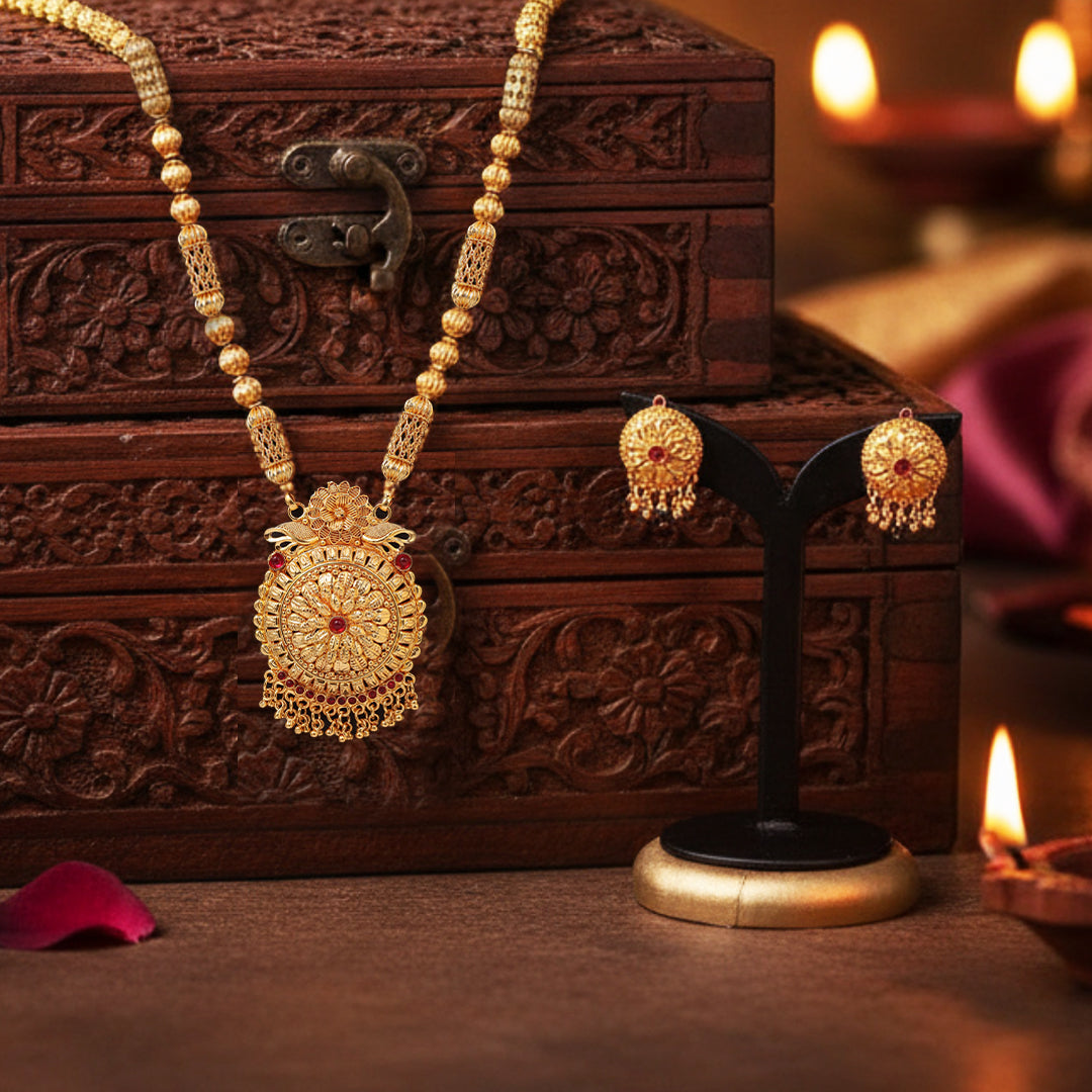 his gold inlaid Solar Bloom long mala set, a 24k SmartGold is a finished pendant that blooms like a sun-kissed mandala. Delicate filigree unfurls in perfect symmetry, while tiny golden danglers add graceful movement to its ornate form. Paired with a long, intricately crafted chain, it embodies the timeless elegance of ceremonial artistry.