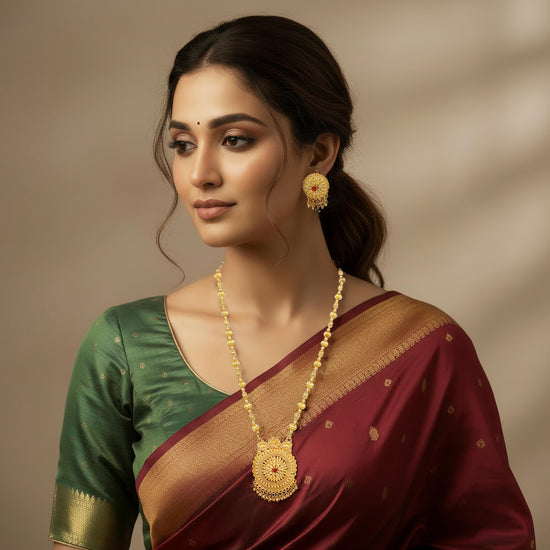Introducing the gold inlaid Sunborne Majesty long mala set, this 24k gold pendant gleams with delicate filigree and raised motifs, glowing with the warmth of timeless craft. Suspended from a long, beaded chain, it carries the quiet majesty of regal adornment, a piece that feels both ancient and eternally elegant.