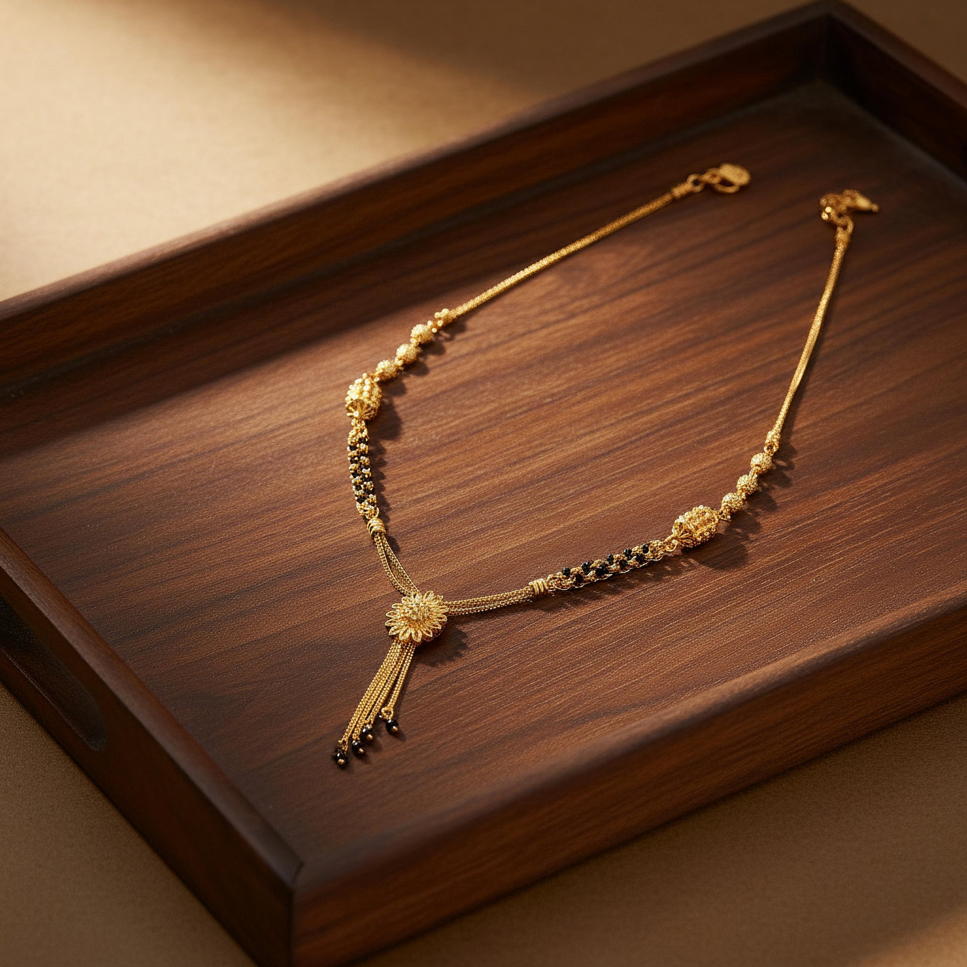 Introducing the gold inlaid Sunshadow Bloom mangalsutra, A golden sunflower unfurls in a timeless bloom at the center of this striking piece, its aged petals radiating quiet brilliance. From its heart, fine chains fall like dusky rain, each tipped with a dark bead, an elegant contrast of light and shadow. The necklace weaves together gold-toned links and deep, inky knots, creating a harmony of earthy elegance and bold, modern design.