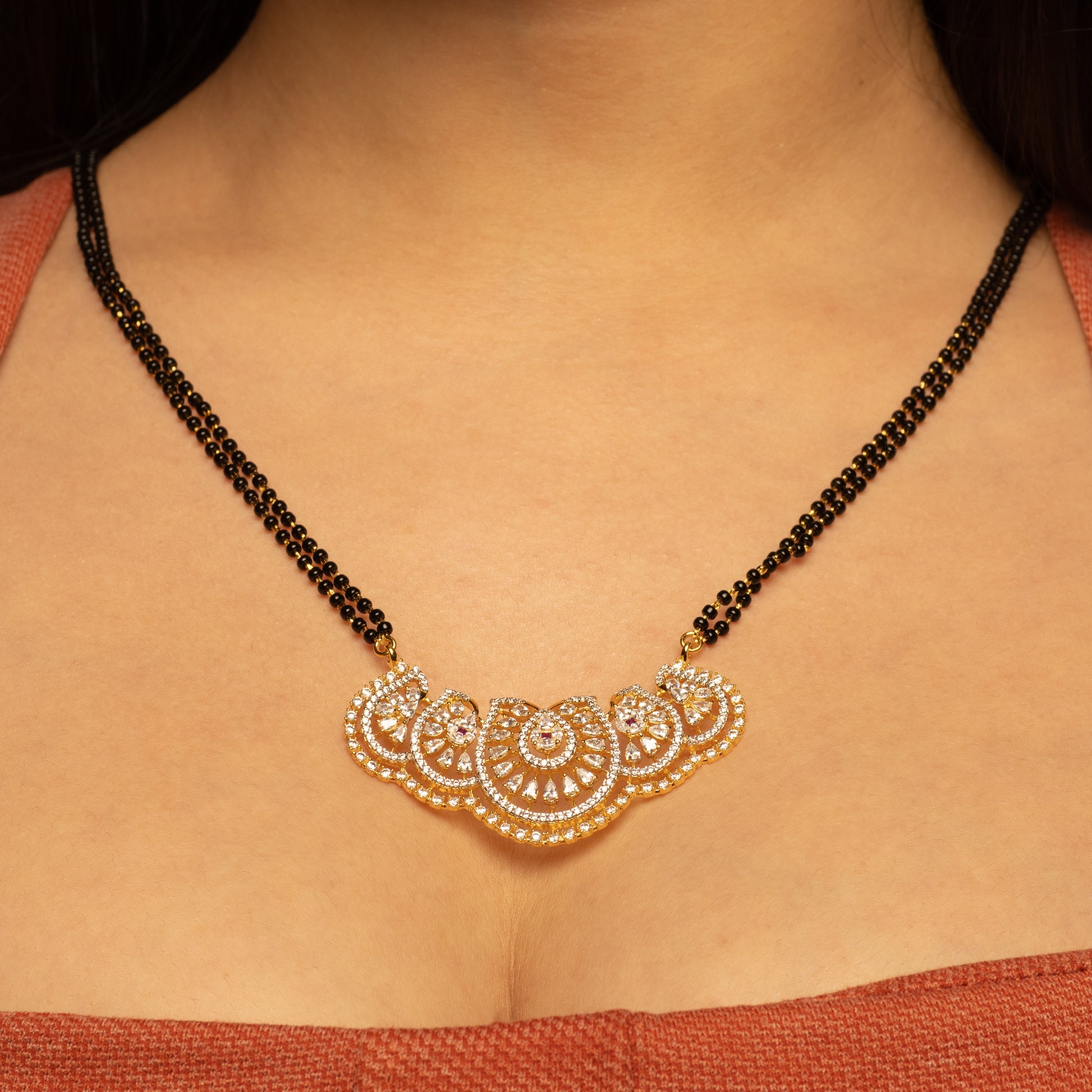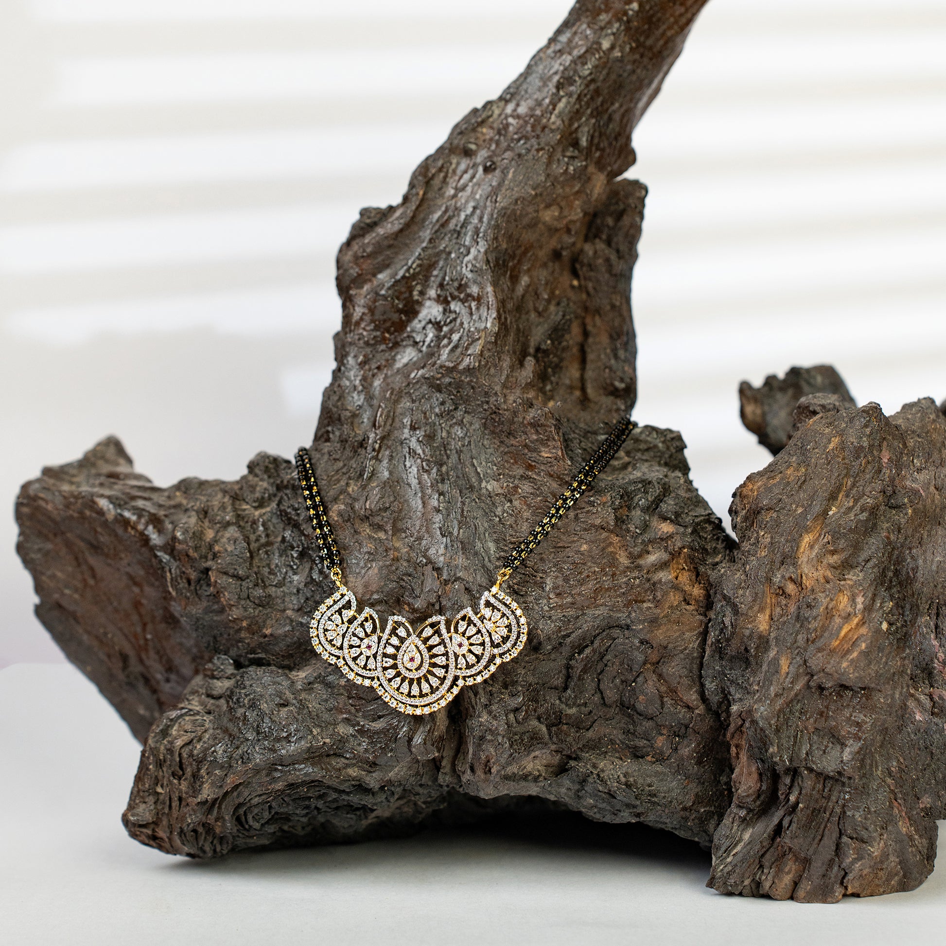 Introducing the Tiara Glow mangalsutra, featuring delicate paisley and floral patterns that intertwine, unfolding in perfect symmetry. The teardrop motif at the bottom is cradled by sweeping, wing-like forms. Its understated style makes it an ideal everyday adornment while still carrying deep cultural significance