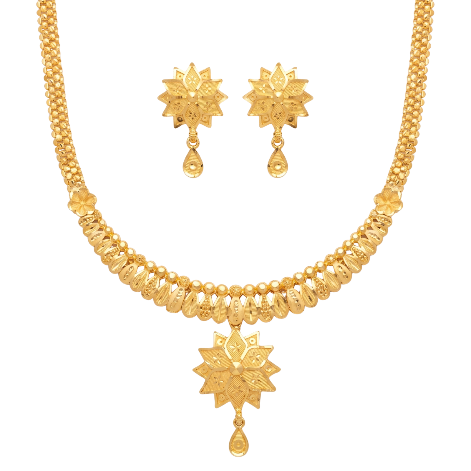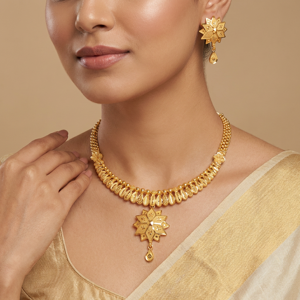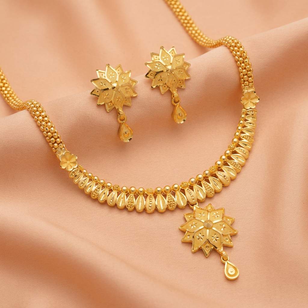 Delicately woven with floral-inspired patterns, the Ritvaa Floral Tapestry Necklace Set captures the beauty of nature in gold. Its intricate design blends softness with sophistication, offering a graceful and feminine appeal. A perfect choice for adding charm to both traditional and contemporary looks.