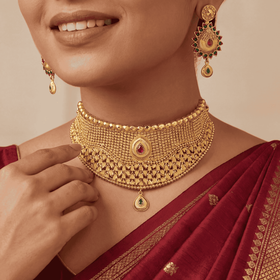 The Ritvaa Heritage Kundan Bloom Choker Set celebrates traditional craftsmanship with blooming kundan details, bringing together heritage and refined luxury.