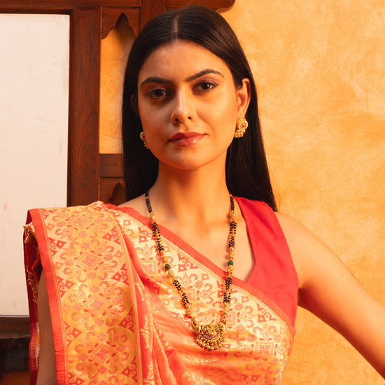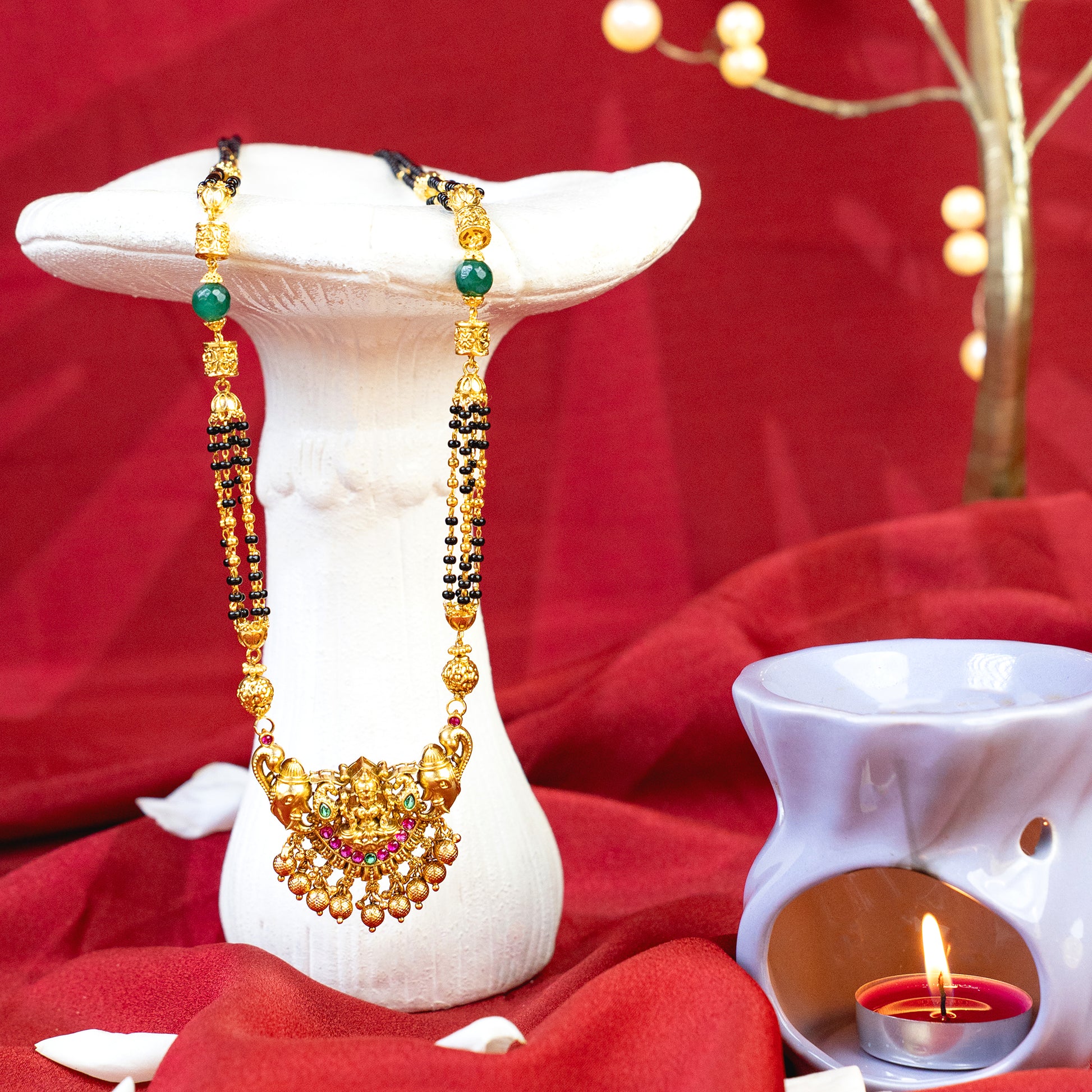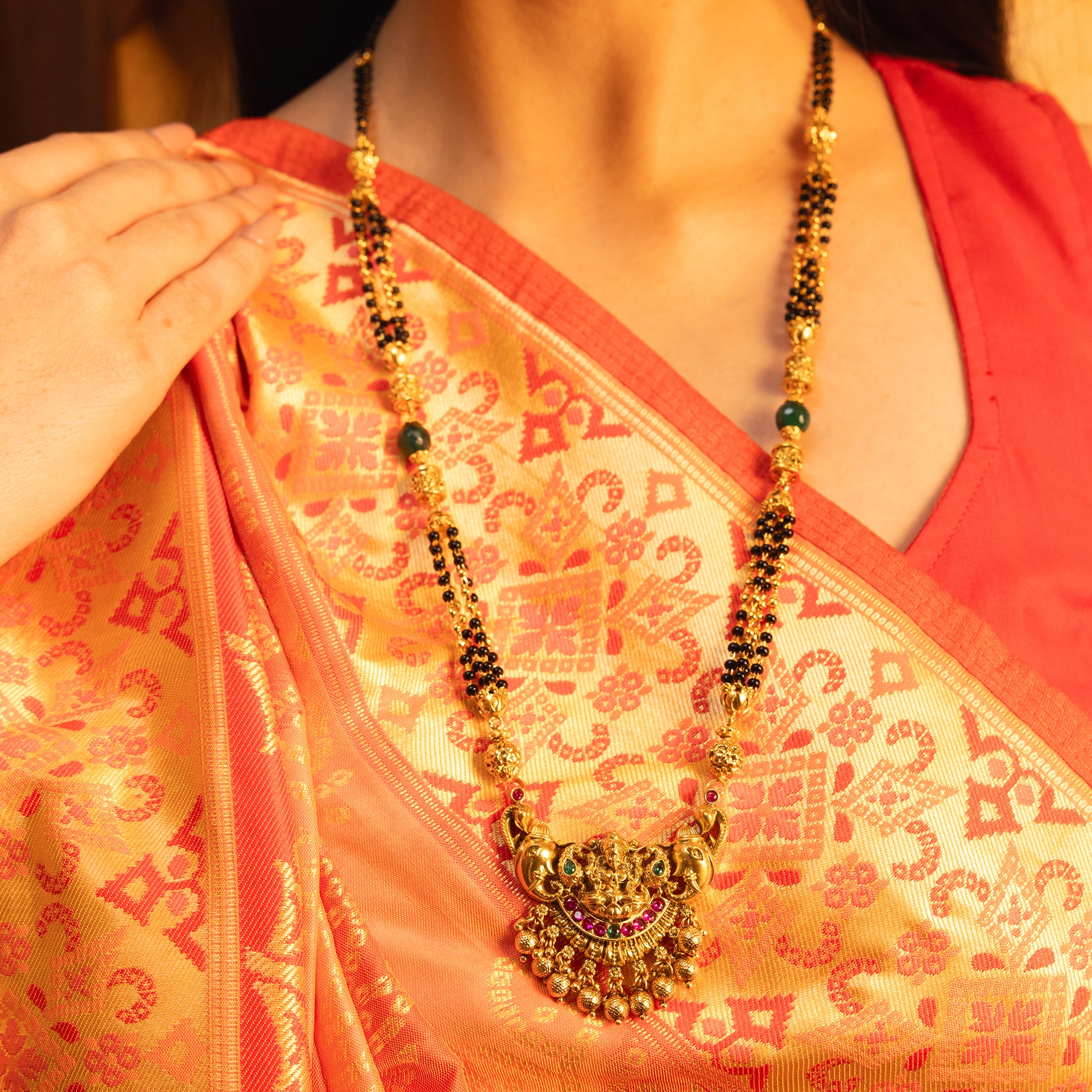 A tribute to timeless devotion of Nakashi Aura mangalsutra. This 24k SmartGold mangalsutra features an antique-finish pendant adorned with the divine Lakshmi, framed by sculpted elephant motifs. Vibrant rubies, emerald accents, and a row of delicate ghungroos bring color, rhythm, and heritage to its intricate Nakashi craftsmanship. A radiant heirloom designed to honor tradition with modern brilliance.