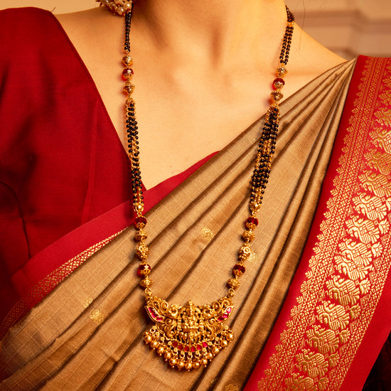 Introducing the gold inlaid Temple Reverance mangalsutra, a vision of divine artistry. This 24k gold antique finish necklace celebrates devotion through exquisite nakashi craftsmanship. At its heart sits a finely carved Lakshmi motif framed by mythical guardians, accented with ruby-hued stones that lend a quiet glow. A timeless heirloom, crafted to be treasured across generations.
