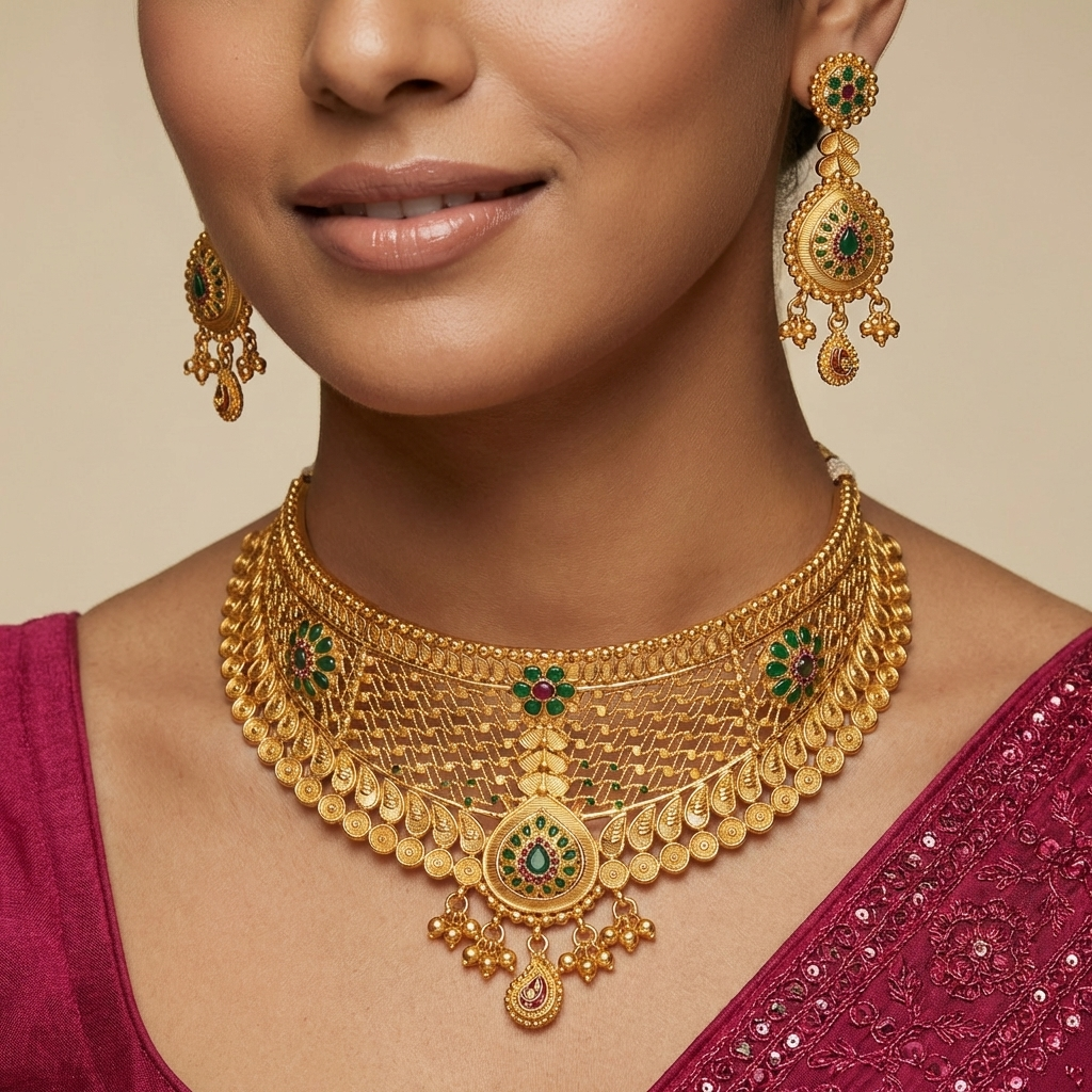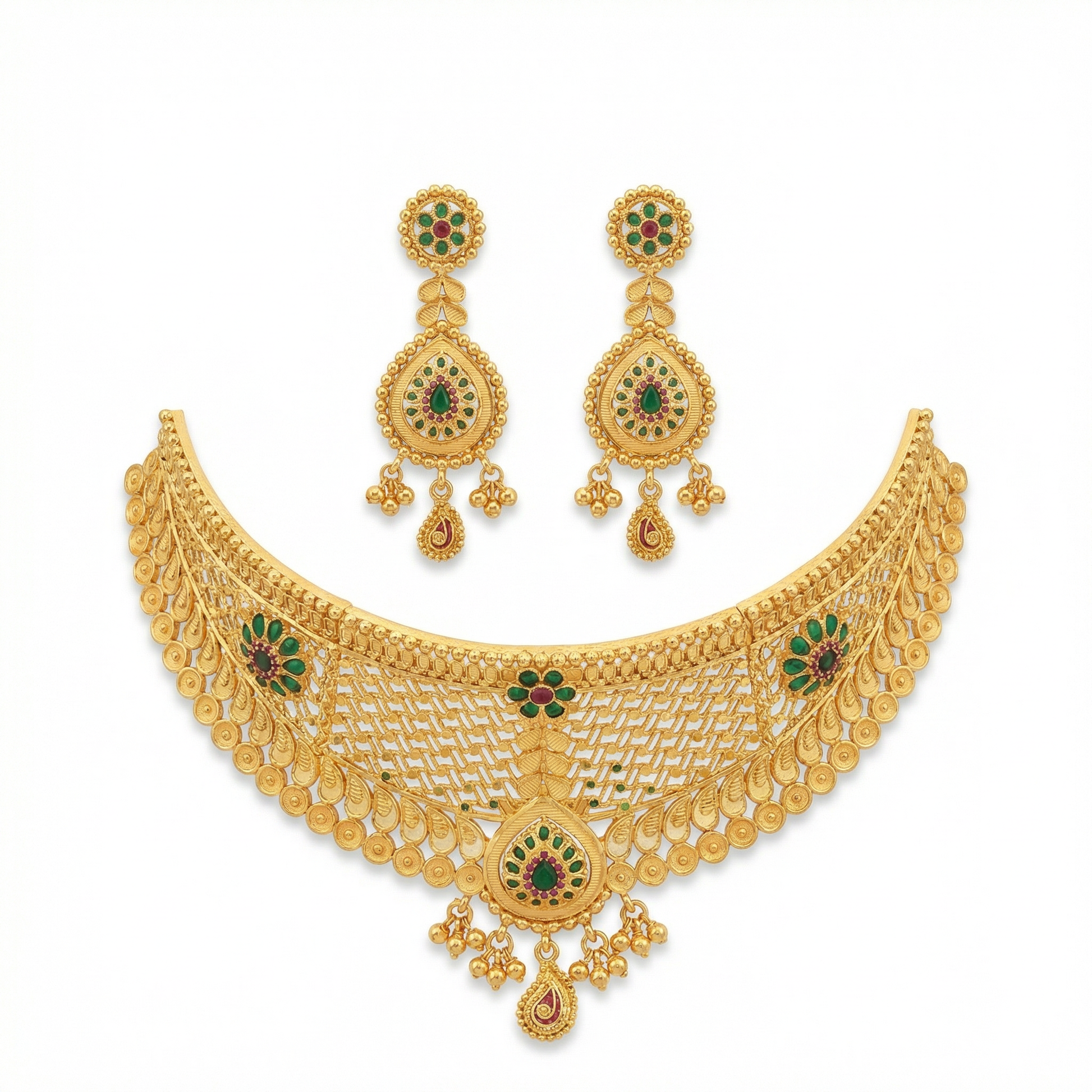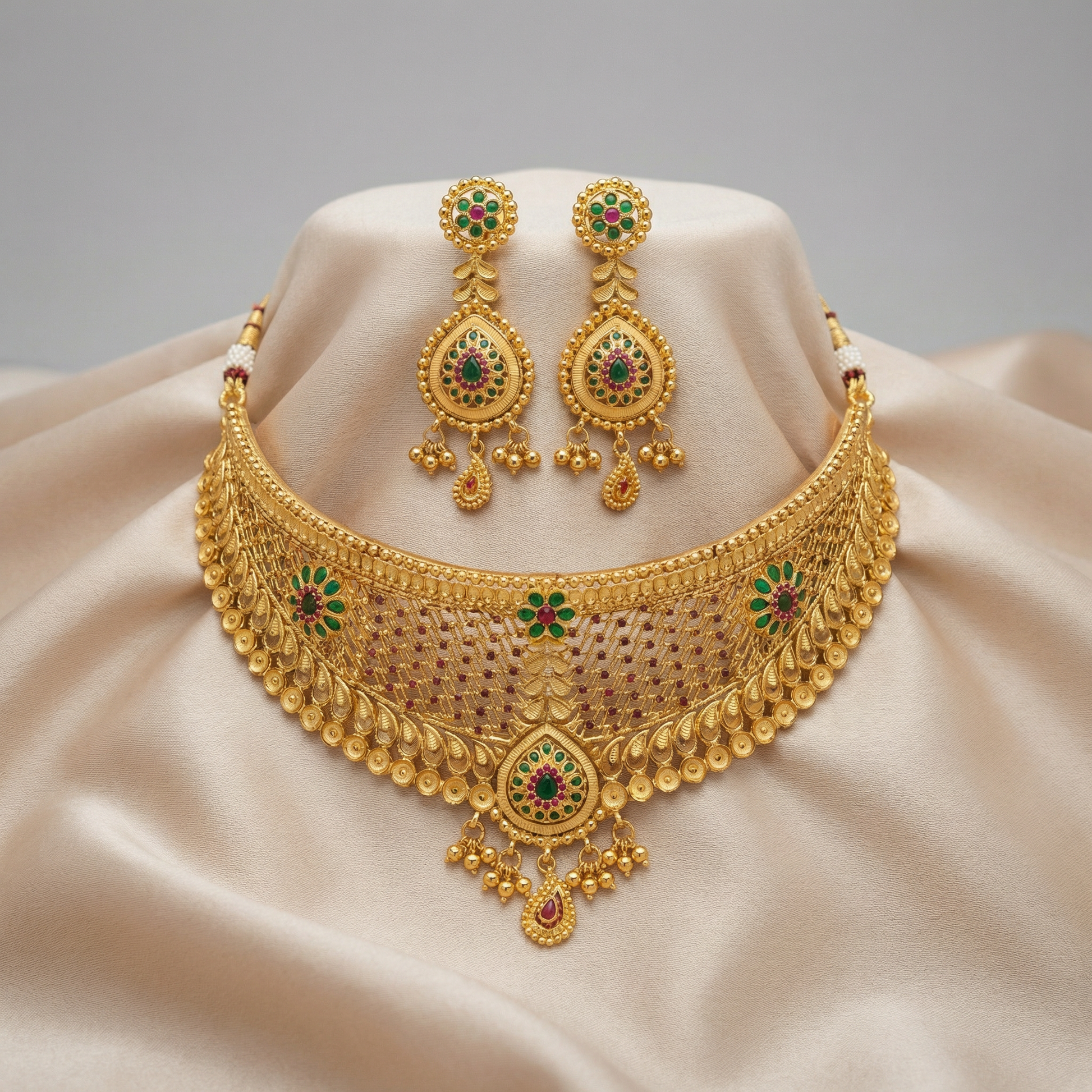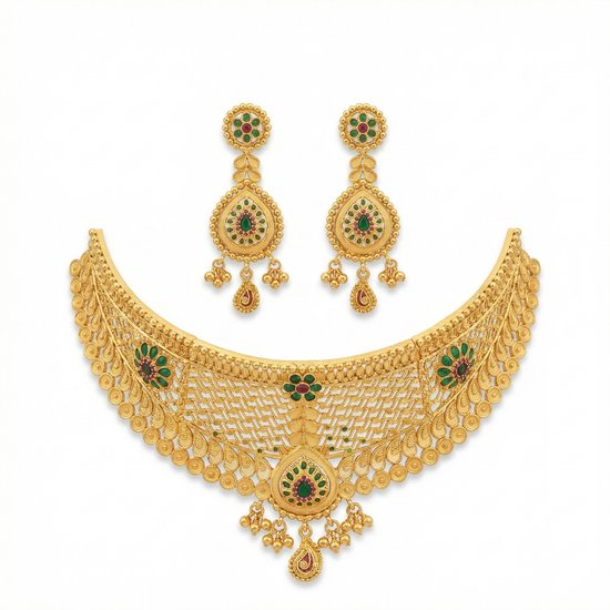 The Ritvaa Imperial Petal Choker Set is a graceful blend of delicate floral artistry and royal elegance, designed to add a soft yet majestic charm to your traditional look.