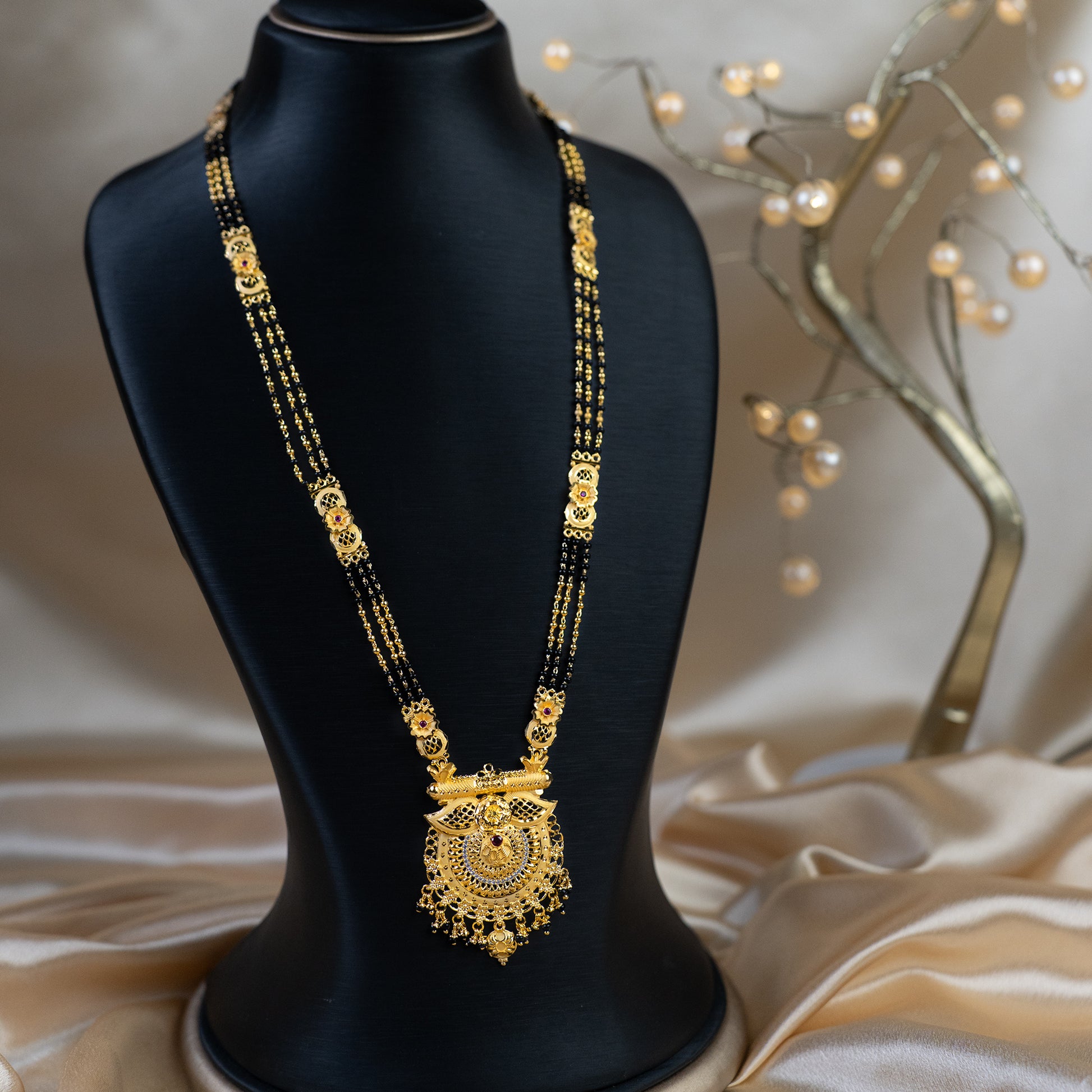 This gorgeous Everlasting Grace Mangalsutra is a statement. The pendant features a sun-kissed medallion woven with tales of old stories. This 24k SmartGold, encircled in a crimson shade, offers a touch of sophistication and grace to celebrate the sacred bond of marriage with subtle brilliance.
