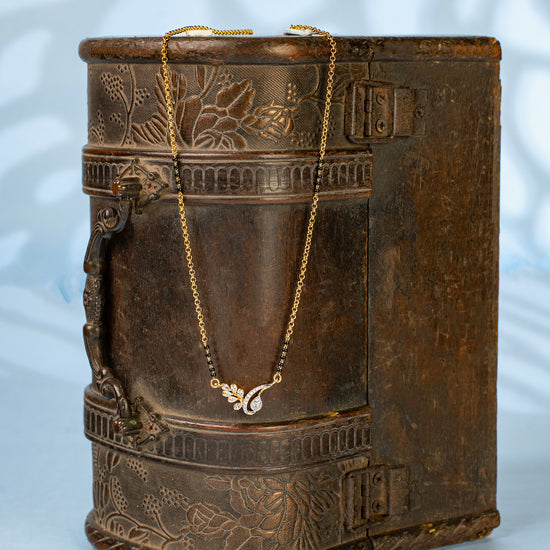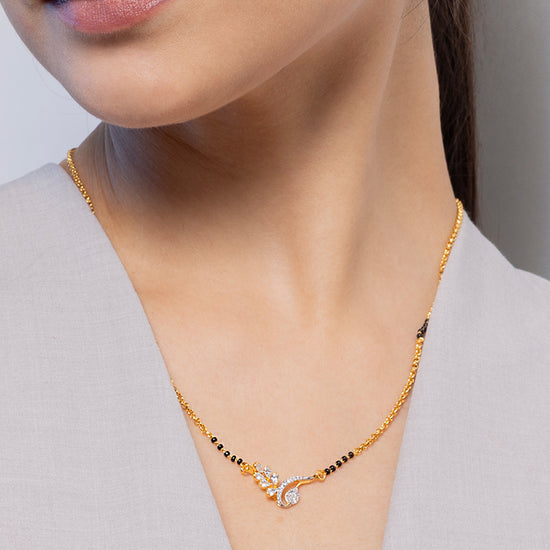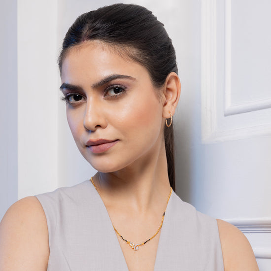 This sequinned beauty of an Autumn Dew mangalsutra captures the charm of delicate floral artistry while symbolising love and tradition. Designed for the modern woman, this 24k gold mangalsutra seamlessly pairs with both ethnic attire and everyday wear, making it a timeless piece that radiates grace and sophistication.