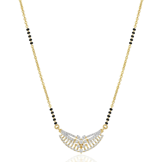 The golden tapestry of this Celestia mangalsutra highlights the floral artistry in the centre, surrounded by a chain of numerous beads. Designed with elegant black beads and this piece strikes the perfect balance between tradition and contemporary style. Lightweight and versatile, it’s ideal for both everyday wear and special occasions.