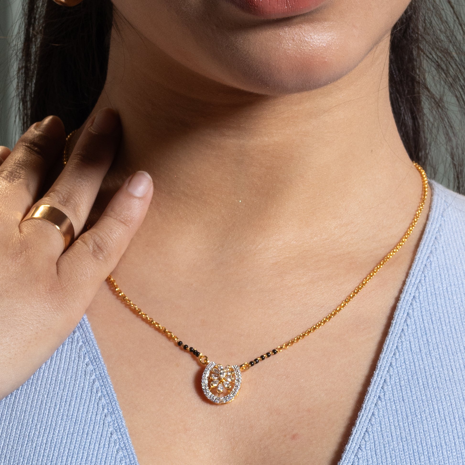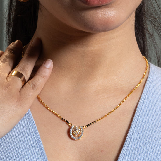 This charm Arc mangalsutra is a true statement of grace and grandeur. Featuring a gold-toned horseshoe pendant edged with small clear stones and featuring a central cluster of larger stones in a delicate floral pattern. This piece beautifully balances tradition and elegance, radiating timeless sophistication, making it an exquisite member of your collection.