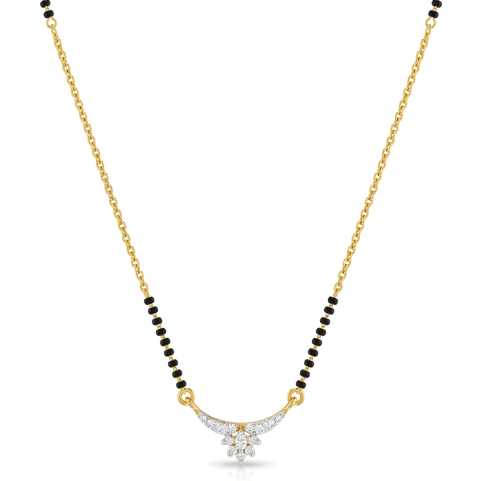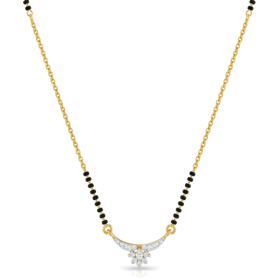 This sequinned beauty of a Crescent Bloom mangalsutra is adorned with sparkling stones, capturing the charm of beautiful floral artistry while symbolising love and tradition. Designed for the modern woman, this mangalsutra seamlessly pairs with both ethnic attire and everyday wear, making it a timeless statement.