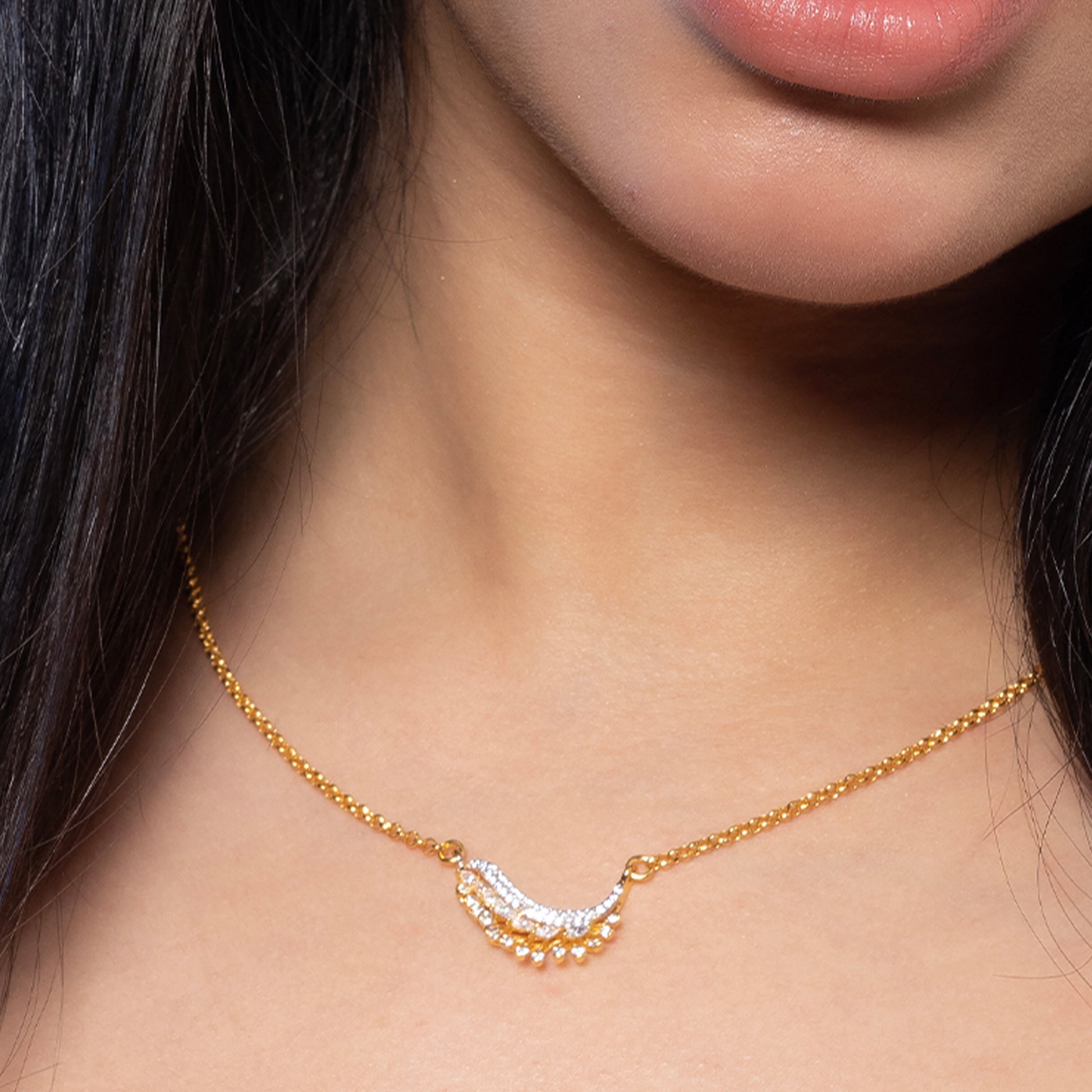 Enhance the glow with our Dew Drop mangalsutra. This 24k gold smart gold feels like a light breeze on your neck. Designed to be durable and radiant, this piece strikes the perfect balance between tradition and contemporary style. Lightweight and versatile, it’s ideal for both everyday wear and special occasions.