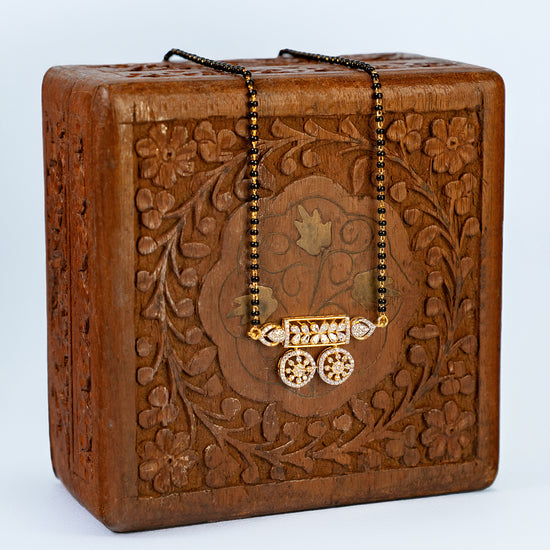 Introducing the Divine Circles mangalsutra. It features a sleek hoverboard gliding on wheels cloaked in a shimmer of silver beads. Designed for the modern woman, this 24k gold mangalsutra seamlessly pairs with both ethnic attire and everyday wear, making it a timeless piece that radiates grace and sophistication.