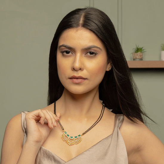 Introducing the Emarald Radiance mangalsutra. The pendant features a combination of rectangular green stones with a halo of smaller clear stones. Designed for the modern woman, this 24k mangalsutra seamlessly pairs with both ethnic attire and everyday wear, making it a timeless piece that radiates grace and sophistication.