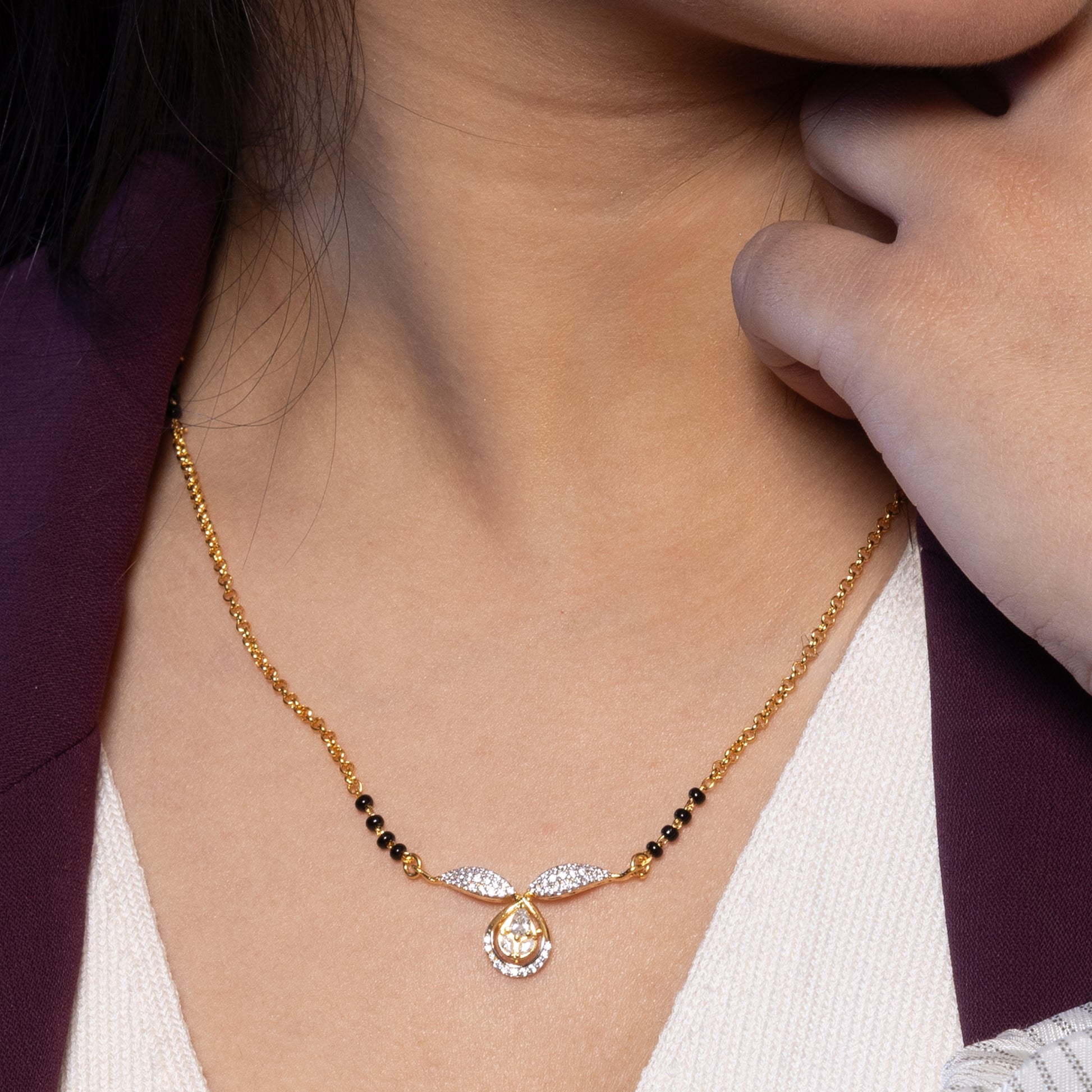 Introducing the Glow Wing mangalsutra. It features a gilded teardrop borne aloft by wings of light, each feather a constellation of diamonds. A timeless accessory that blends tradition with contemporary style, it’s made to celebrate your most meaningful moments. Crafted with 24k gold smart gold, it captures the beauty of togetherness while adding a touch of modern grace.