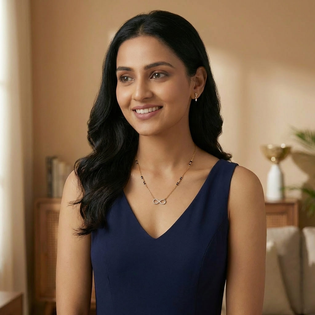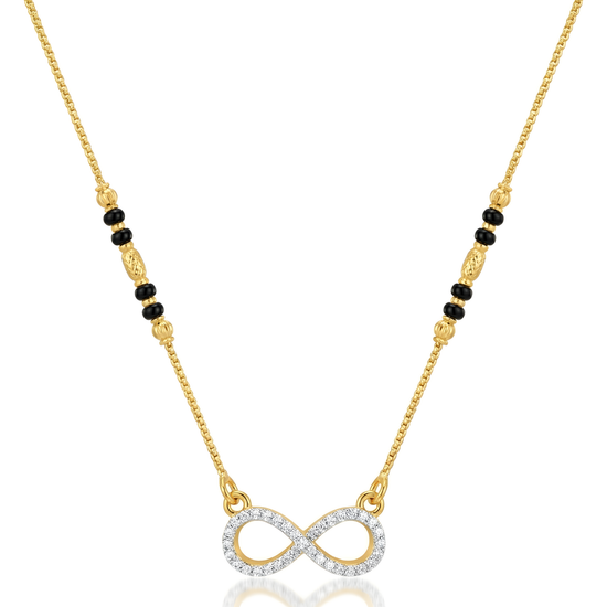 This golden infinity mangal sutra, adorned with a constellation of shimmering stones, its graceful loops whisper the promise of an eternal bond. This 24k gold tone, this waterproof and anti-tarnish necklace effortlessly enhances casual, office, or evening outfits, adding a modern yet classic touch to both every day and festive ensembles.