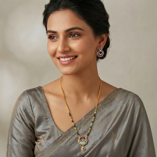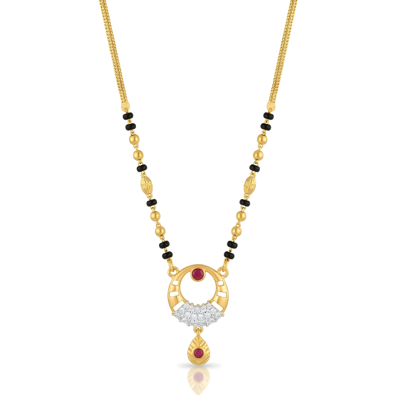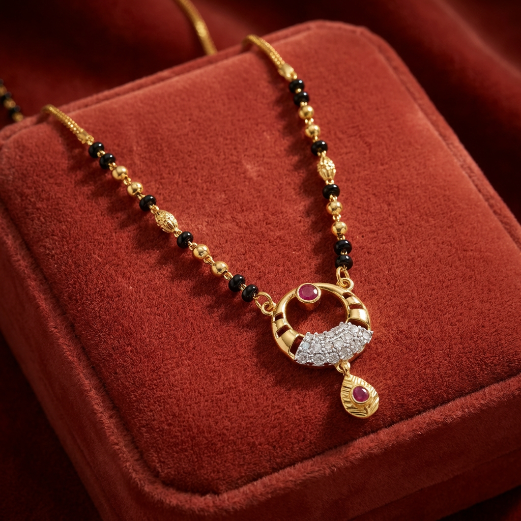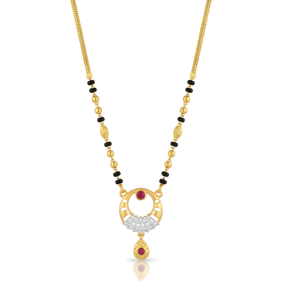 A measured rhythm of gold links and black beads leads to a sculpted circular pendant, open at its heart and bordered with fine detailing. A ruby-toned drop rests gently below, adding warmth and movement to the design. Balanced and intimate, this mangalsutra feels like a constant. Surrounding, protecting, and softly holding what matters most.