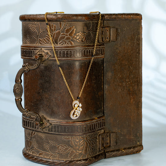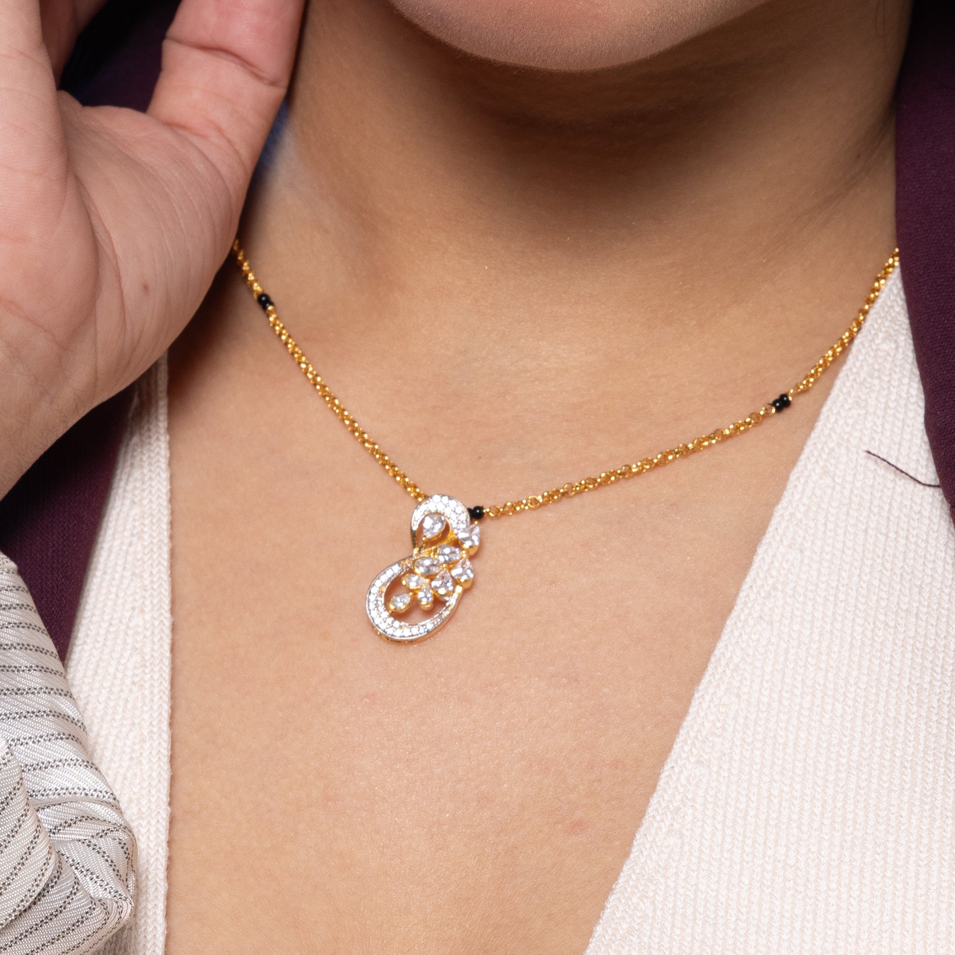 The elegant Paisley elegance mangalsutra is a gold-toned pendant that swirls like liquid light, its curves traced with tiny, glimmering stones and a cluster of pear-shaped gems gathered softly to one side. This 24k smart gold is perfect for daily elegance as well as special occasions, making it a timeless expression of love and grace.