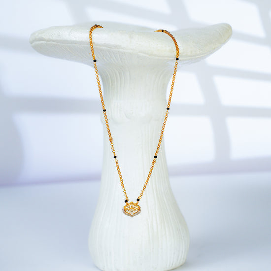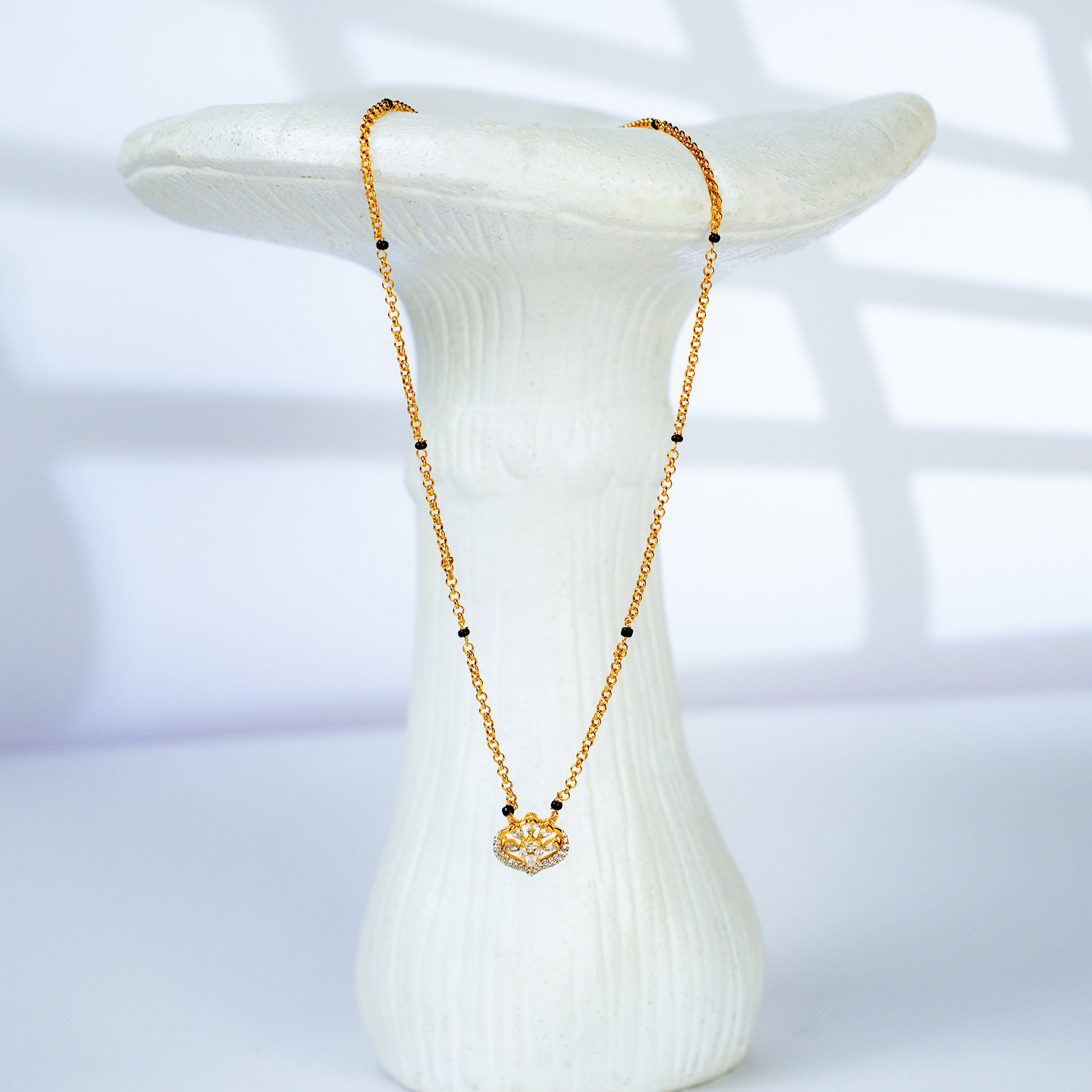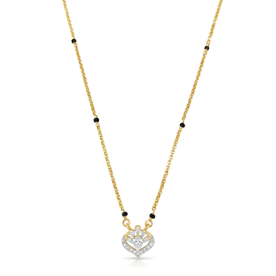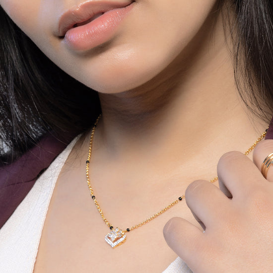 Introducing our Queen of hearts mangalsutra. A gold heart-shaped pendant is a cluster of sparkling diamonds like tiny stars. This 24k gold mangalsutra is lightweight yet striking — making it the perfect symbol of love and commitment that complements both everyday wear and festive occasions.
