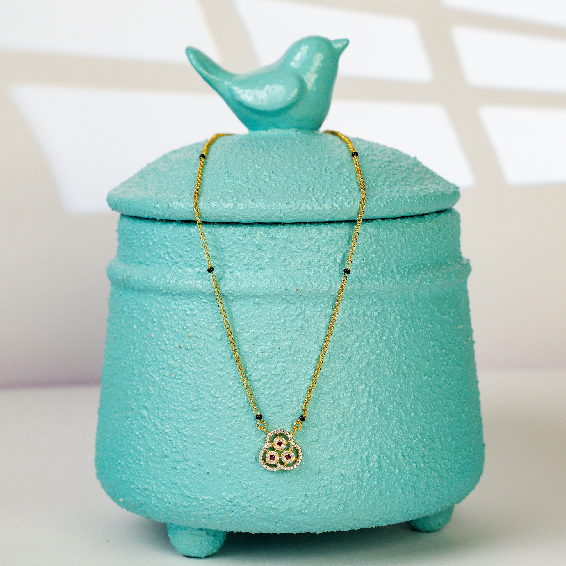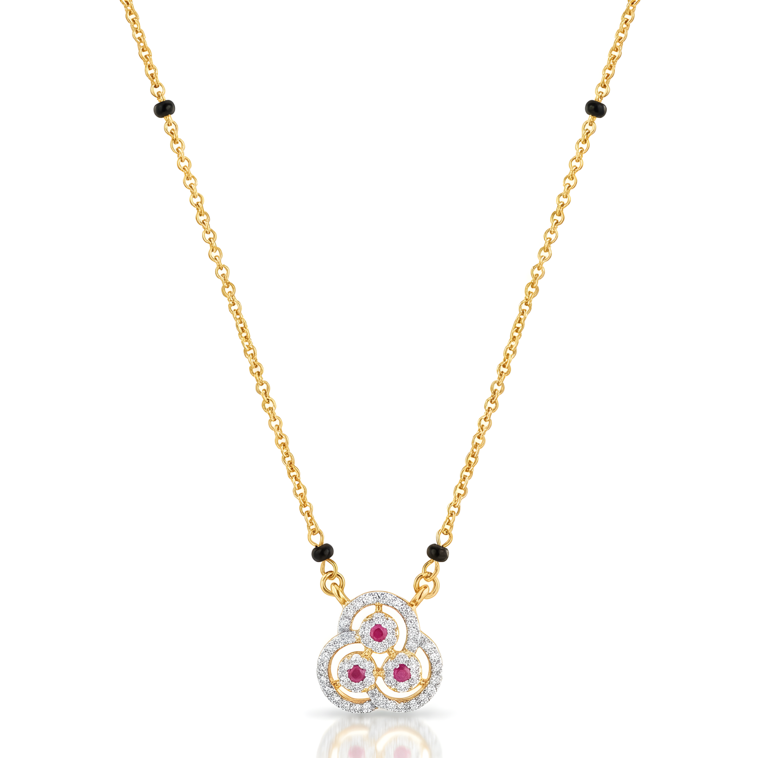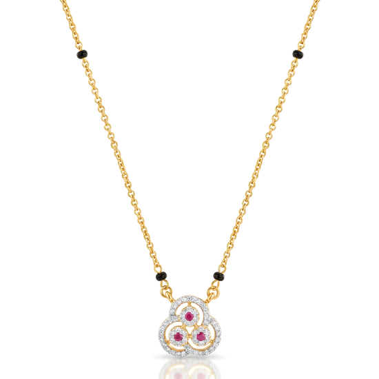 The sequinned Trinity Mangalsutra is designed to celebrate the sacred bond of marriage. This mangalsutra is a modern reinterpretation of a timeless symbol. This 24k SmartGold design features a triquetra diamond embedded within, with a little ruby in the centre. This piece effortlessly complements both everyday ensembles and special occasions.