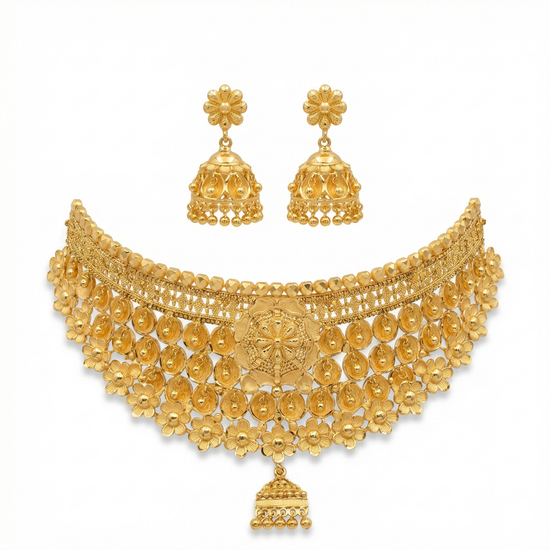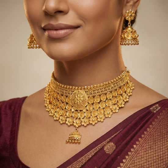 The Ritvaa Swarna Shringar Choker Set reflects the richness of gold and the timeless essence of bridal shringar, perfect for elevating your festive and wedding attire.